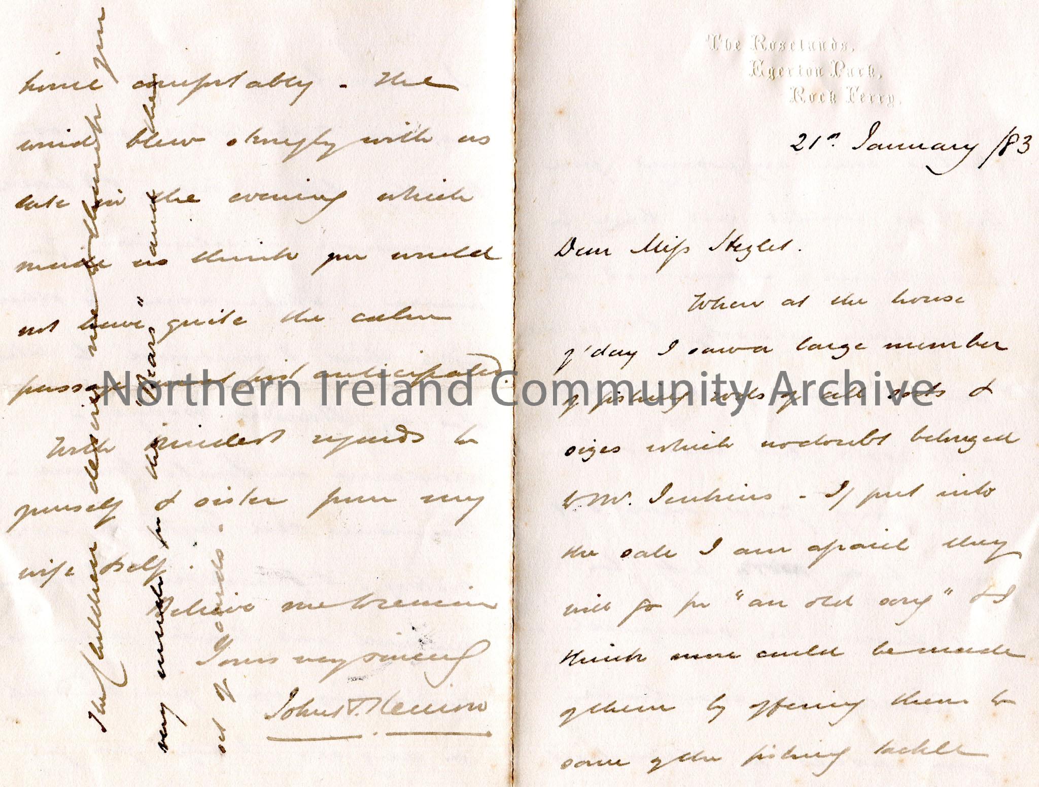 Handwritten letter, double sided, to Miss Hezlet. Writing re fishing rods found at a house and had belonged to Mr Jenkins. Refers to several books left by Miss Hezlet. Mentions windy weather which may have made the passage for Miss Hezlet less calm than thought. Sentence written vertically on last page re Church.
