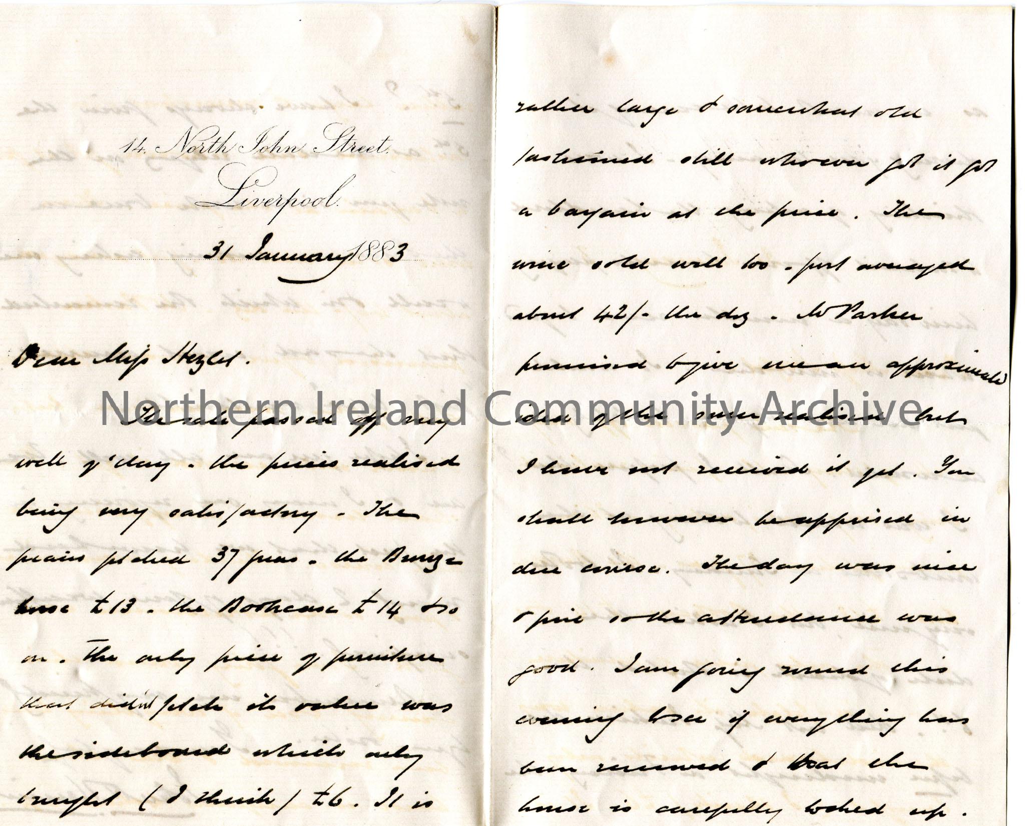 Handwritten letter, double sided, to Miss Hezlet. Writing re the sale of furniture at an auction for Miss Hezlet.