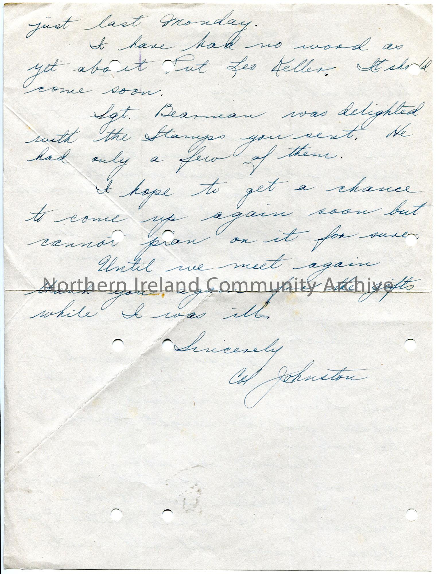 Handwritten letter (double sided) to Mr and Mrs Henry. They have recovered from a fever after spending time in hospital. Thanks Sam for sending the honey and carnations. Has not heard from Leo Keller. Sergeant Bearman was delighted with stamps Sam sent him.