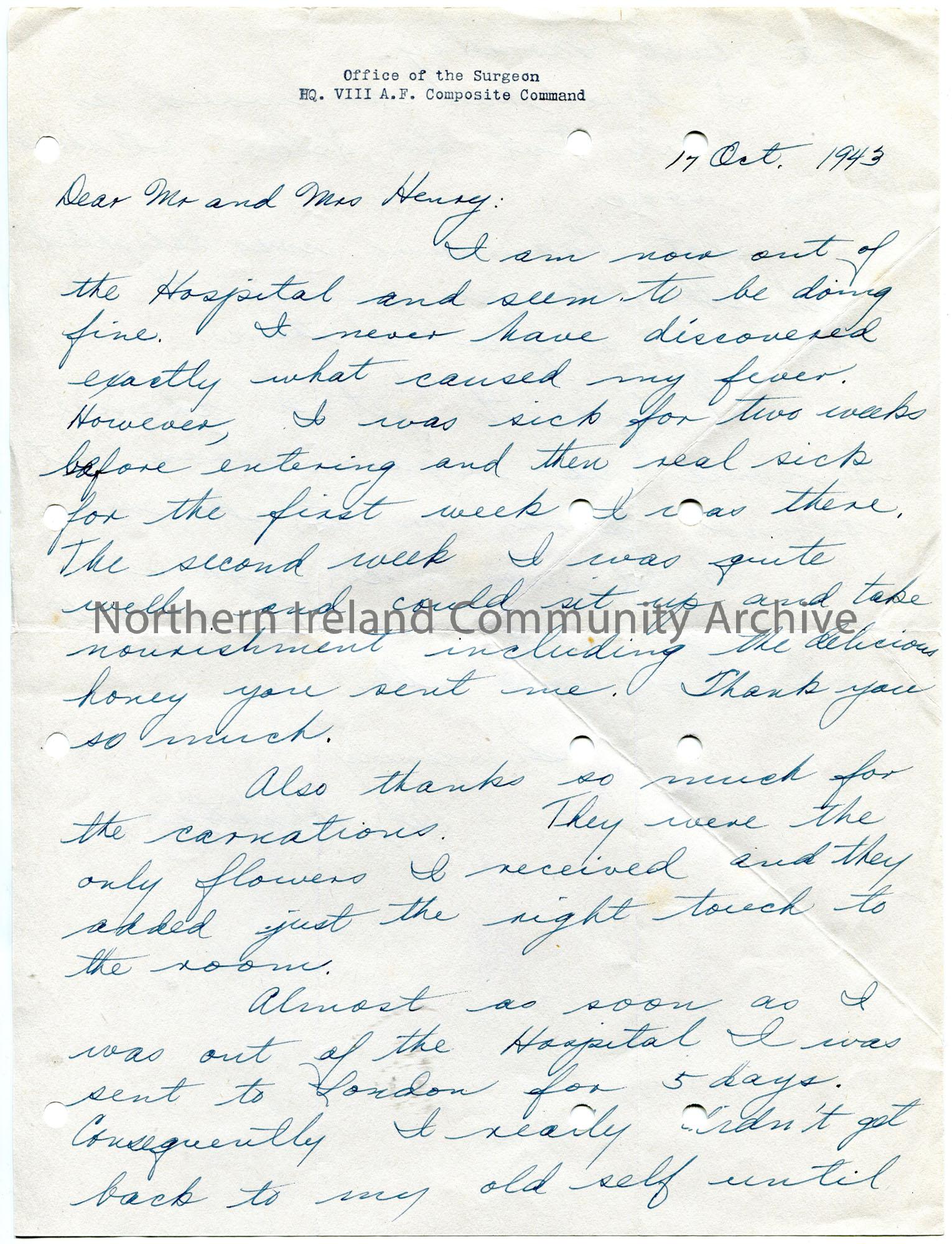 Handwritten letter (double sided) to Mr and Mrs Henry. They have recovered from a fever after spending time in hospital. Thanks Sam for sending the honey and carnations. Has not heard from Leo Keller. Sergeant Bearman was delighted with stamps Sam sent him.