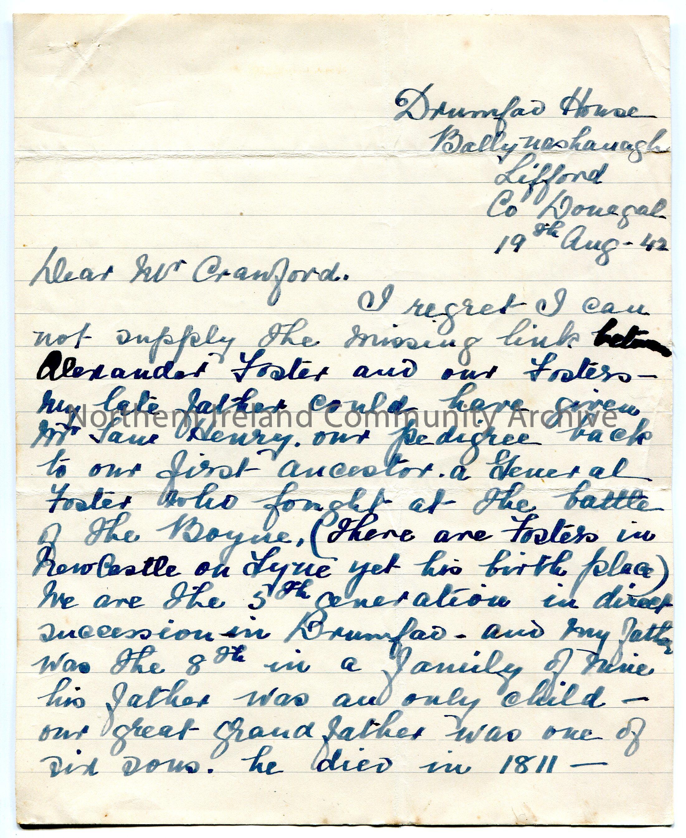 Handwritten letter (double sided) to Mr Crawford. Writing re genealogical information re Foster family. Mentions Sam Henry.