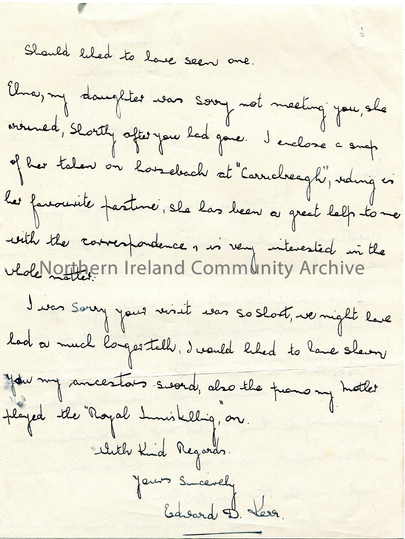 Handwritten letter (double sided) to Mr Henry. Encloses answers to questions asked by Sam along with an extract 'The Parish of Devenish' by Rev W B Steele. Answers were to help Sam with his research into the origin of the song 'The Star Spangled Banner'. Mr Kerr has been helped with his correspondence by his daughter Elna and encloses photograph of her on horseback at Carrickreagh.