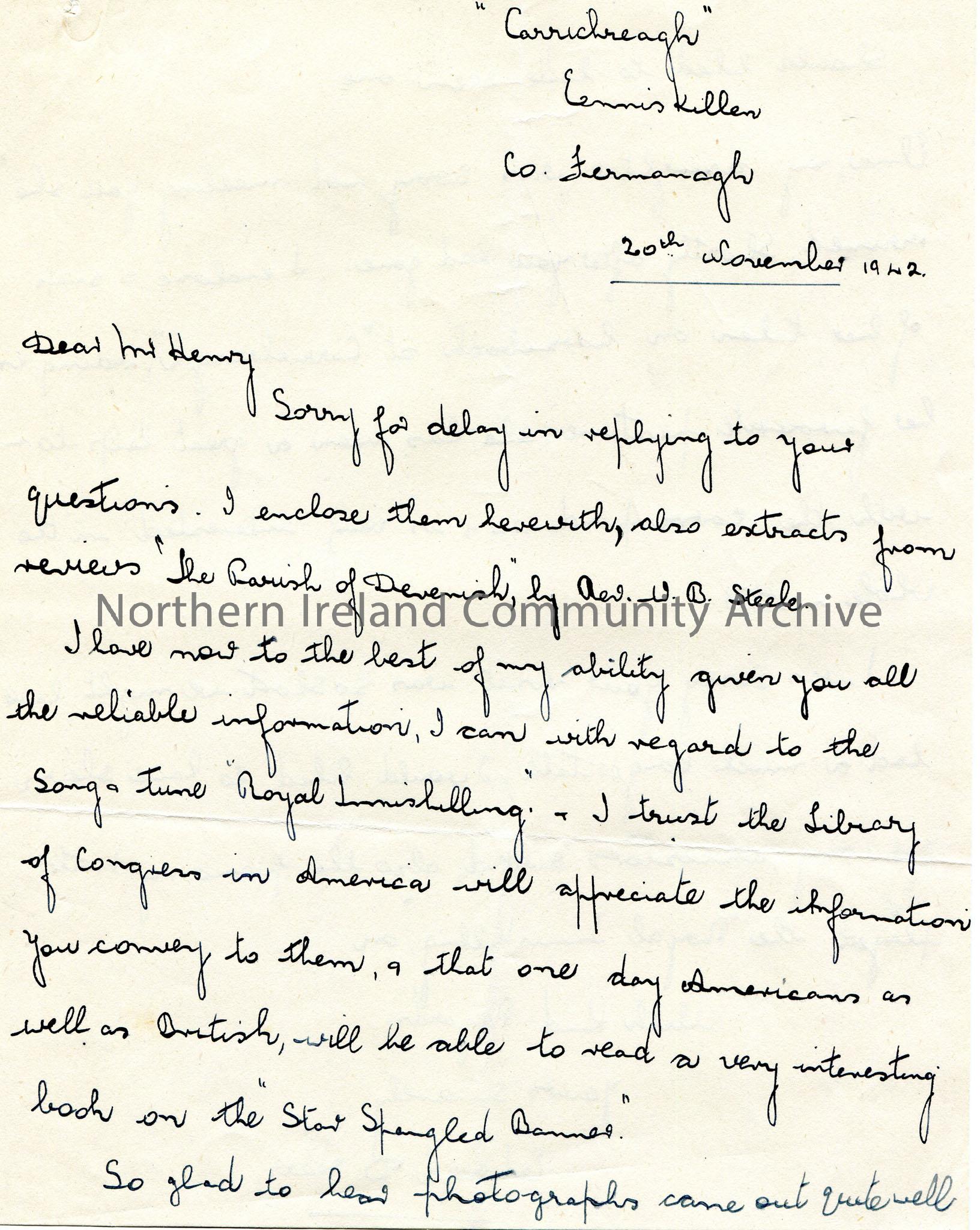 Handwritten letter (double sided) to Mr Henry. Encloses answers to questions asked by Sam along with an extract 'The Parish of Devenish' by Rev W B Steele. Answers were to help Sam with his research into the origin of the song 'The Star Spangled Banner'. Mr Kerr has been helped with his correspondence by his daughter Elna and encloses photograph of her on horseback at Carrickreagh.