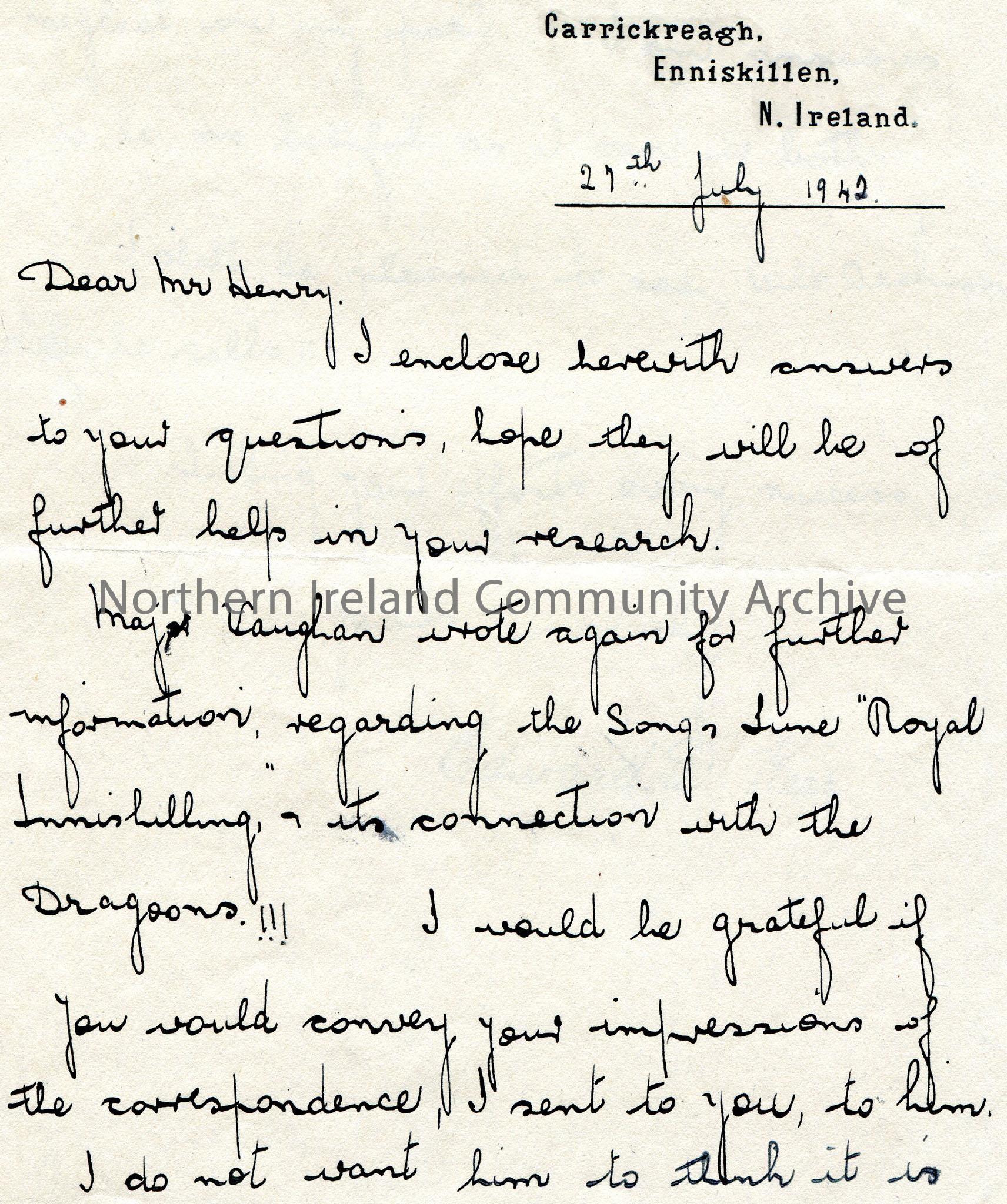 Handwritten letter (double sided) to Mr Henry. Encloses answers to questions asked by Sam. Mentions Major Vaughan and the song ‘Royal Inniskilling’. A…