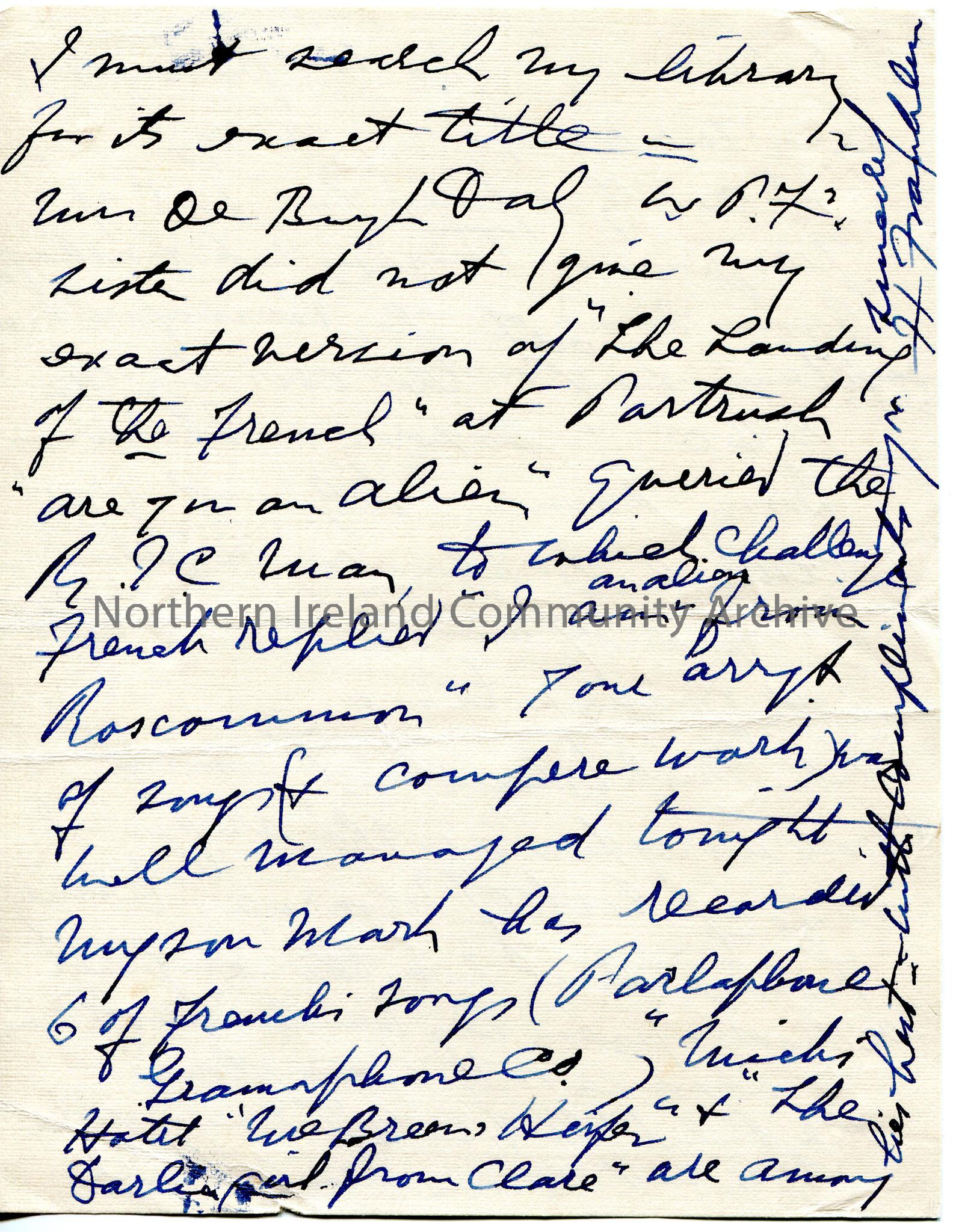 Handwritten letter (double sided) to Mr Henry. Enjoyed the programme last night on the BBC. Mentions ‘The Irish Maiden’ lament. To search their librar… – scan146b