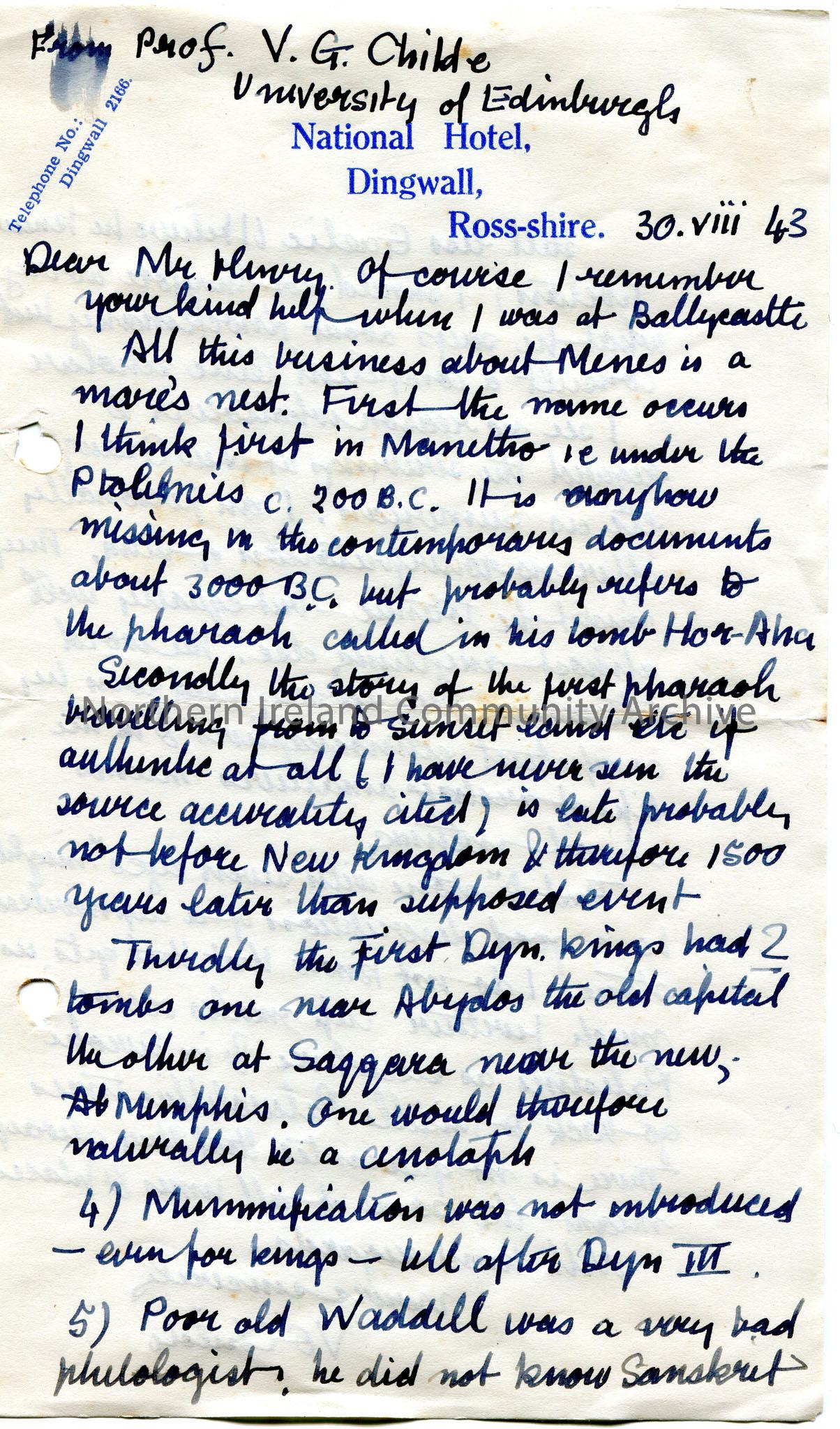 Handwritten letter (double sided) to Mr Henry. Had previously met Sam at Ballycastle. Answering Sam's questions re Pharaohs in the Dynastic Period. Writing re the Pharaoh, Menes, the first Pharaoh, the two tombs of the First Dynasty Kings, mummification, philologist Waddell, scribings at New Grange and 'cup marked' stones.