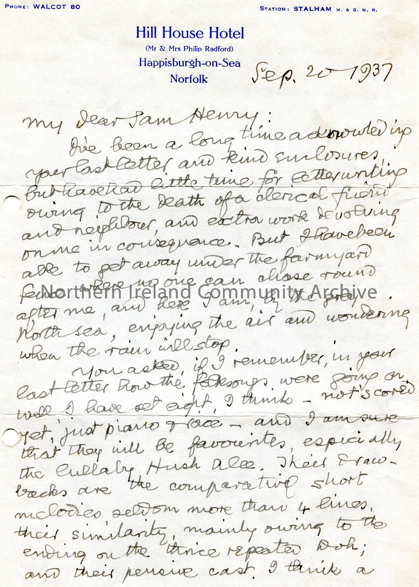 Handwritten letter (double sided) to Mr Henry. Has had little time for reply to Sam due to the death of a cleric. Writes if setting 8 folk songs out o…