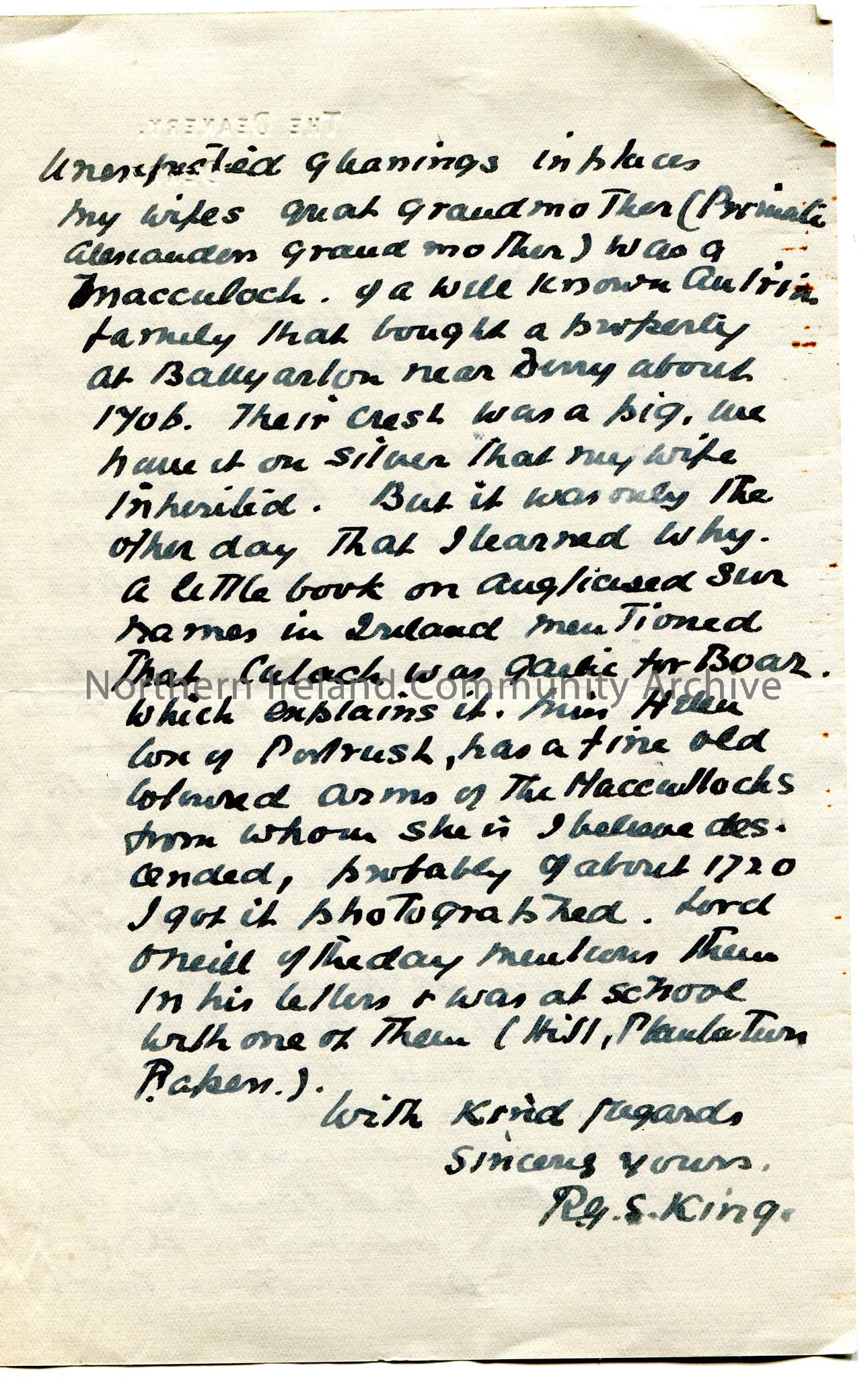 Handwritten letter (double sided) to Mr Henry. Informing Sam he does not know of a connection between the Bennett and O'Hara families. Refers to Rev Richard Bennett; a woman named Hannah; Sir Thomas Bennett of Coleraine; his wife's family name of Macculoch and the family crest is of a pig. Mentions Helen Cox of Portrush as being descended from the Maccullochs.