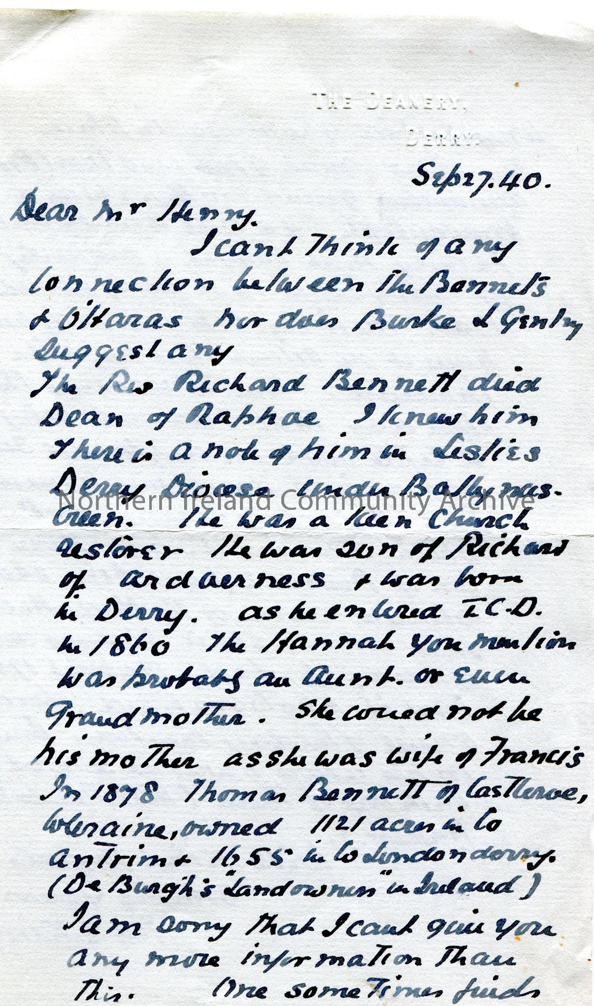 Handwritten letter (double sided) to Mr Henry. Informing Sam he does not know of a connection between the Bennett and O'Hara families. Refers to Rev Richard Bennett; a woman named Hannah; Sir Thomas Bennett of Coleraine; his wife's family name of Macculoch and the family crest is of a pig. Mentions Helen Cox of Portrush as being descended from the Maccullochs.