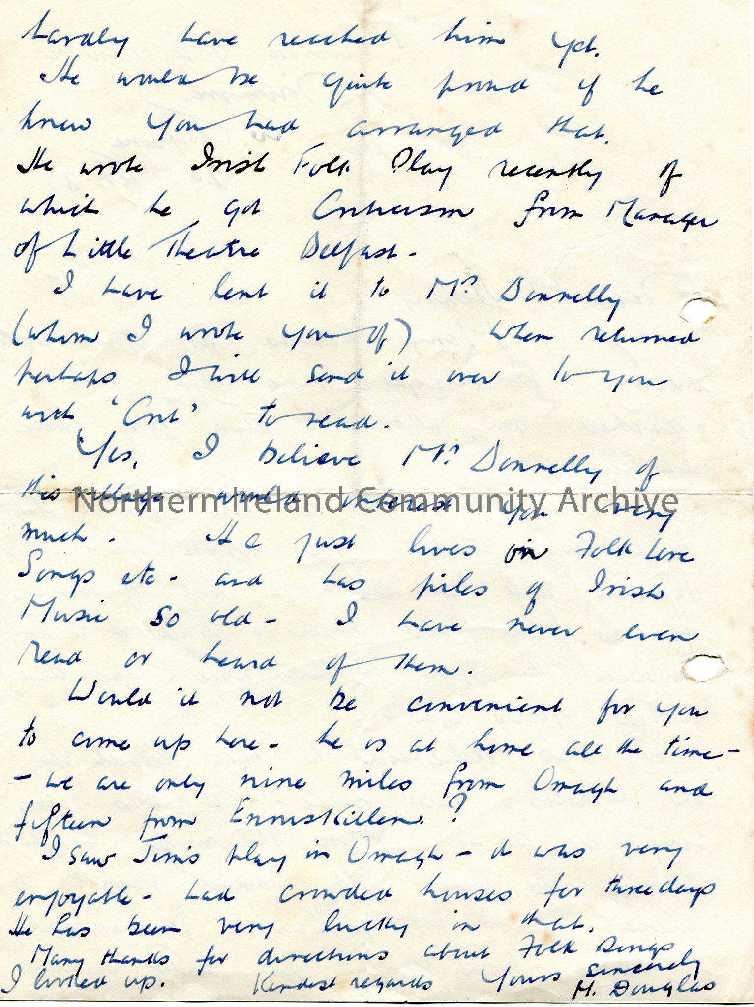 Handwritten letter (double sided) to Mr Henry. Mentions the death of Mr Douglas. Writes of hearing 'Cradle Song' on the wireless and notes that Miss Kearney sang it well. Mentions 'Little Theatre' Belfast. Believes Mr Donnelly of Dromore would interest Sam due to his collection of folk songs and would like Sam to visit. Enjoyed Jim's play in Omagh. Thanks him for direction on folk songs.