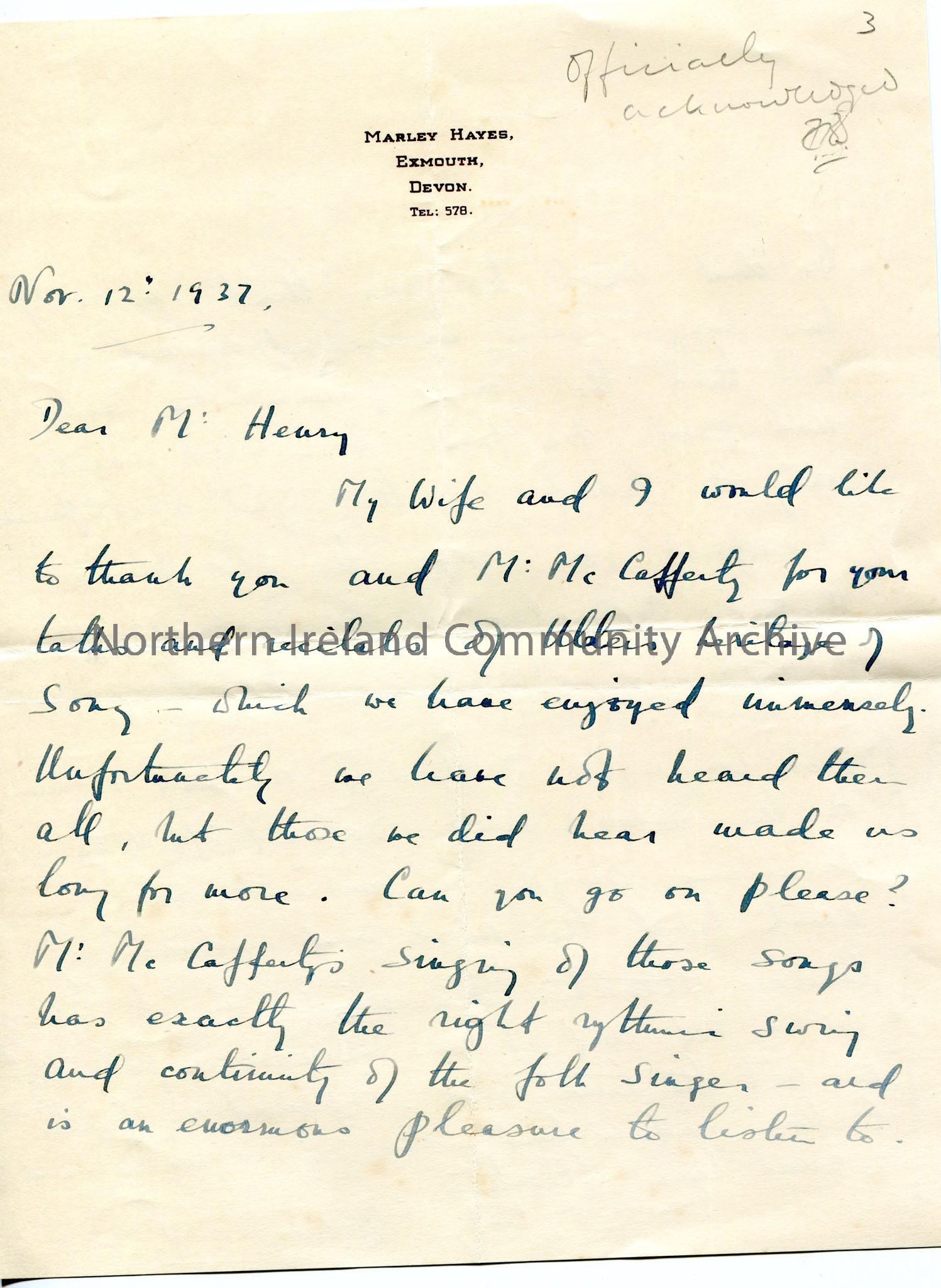 Handwritten letter (double sided) to Mr Henry. 'Officially acknowledged' handwritten in pencil top of page. Writing how much he and his wife have enjoyed the 'Ulster's Heritage of Song' talks. Remarks that Mr McCafferty is a pleasure to listen to but asks that he may sound better unaccompanied. Writes re having played the fiddle with an old woman on Cramp Island, Renvyle, Connemara.