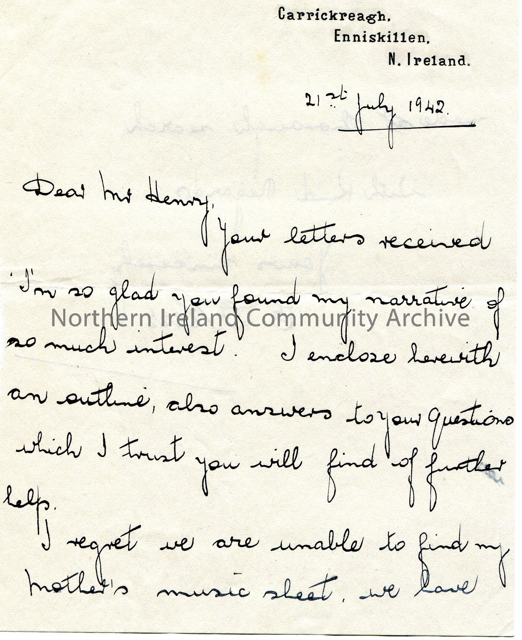 Handwritten letter (double sided) to Mr Henry. Sam found their narrative of interest. Encloses an outline and answers to Sam's questions. They cannot find his mother's music sheet.