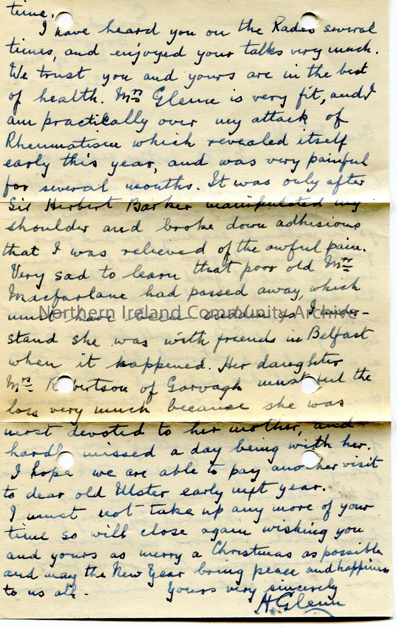 Handwritten letter (double sided) to Mr Henry. Sends their good wishes for Christmas and the New Year. Keen for the war [World War II] to be over. Had to evacuate from Jersey as the Germans took over the Channel Islands. Refers to the 'Jerry' bombing the ship they were on at Guernsey but missed. Listens to Sam's broadcasts on the radio. Writes of his trouble with rheumatism. Mentions that Mrs Macfarlane had passed away and is missed by her daughter, Mrs Robertson of Garvagh. Hopes to visit Ulster next year.