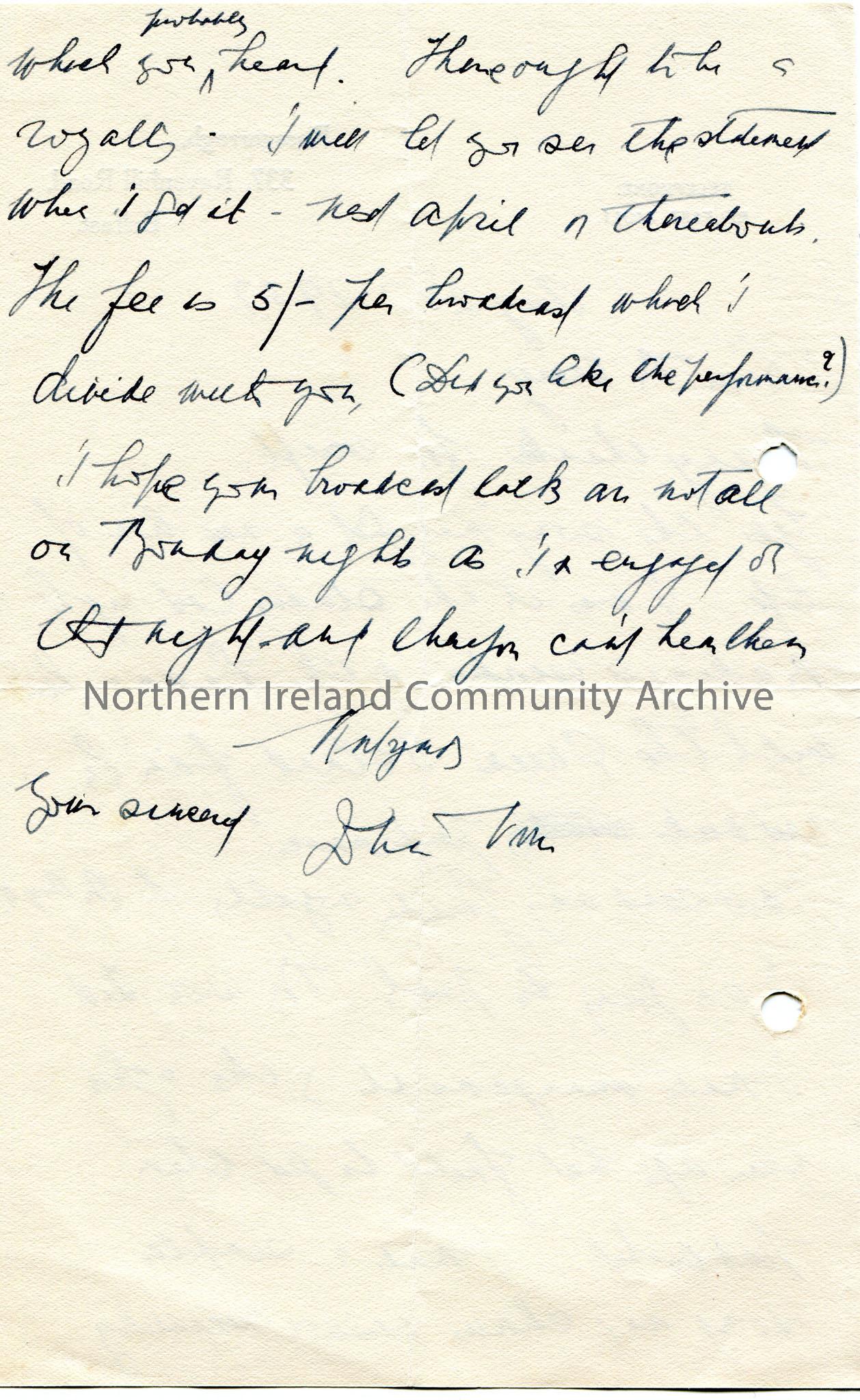 Handwritten letter (double sided) to Mr Henry. Thanks him for a receipt. Has made a recording of the ‘Lammas Fair’ for a performance. Writes of fees f… – scan001b