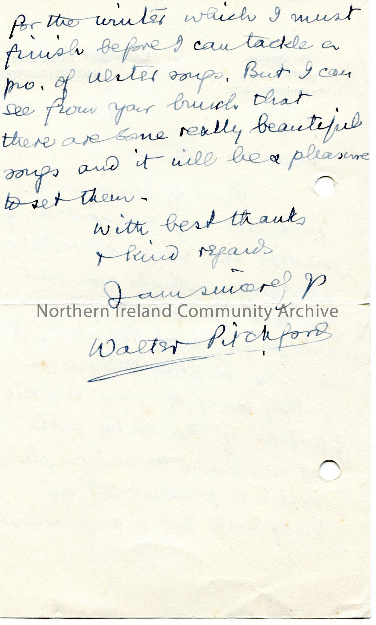 Handwritten letter (double sided) to Mr Henry. Thanks Sam for copy of a newspaper. Will work on a programme of Ulster songs after working on a winter … – scan038b