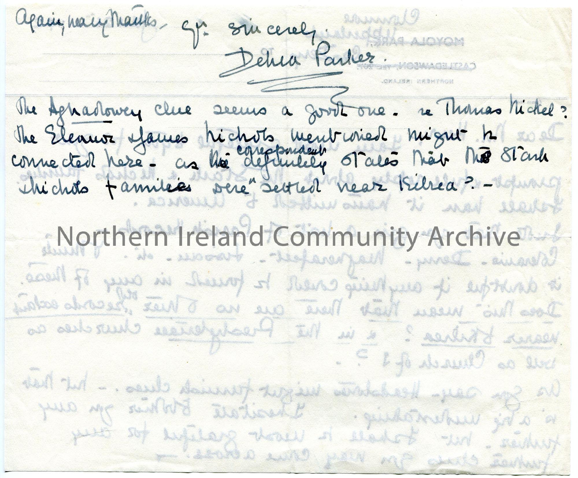 Handwritten letter (double sided) to Mr Henry. Thanks Sam for his reply re Stark and Nichols families. Asks Sam if there are Parish records near to Kilrea as a source of information.