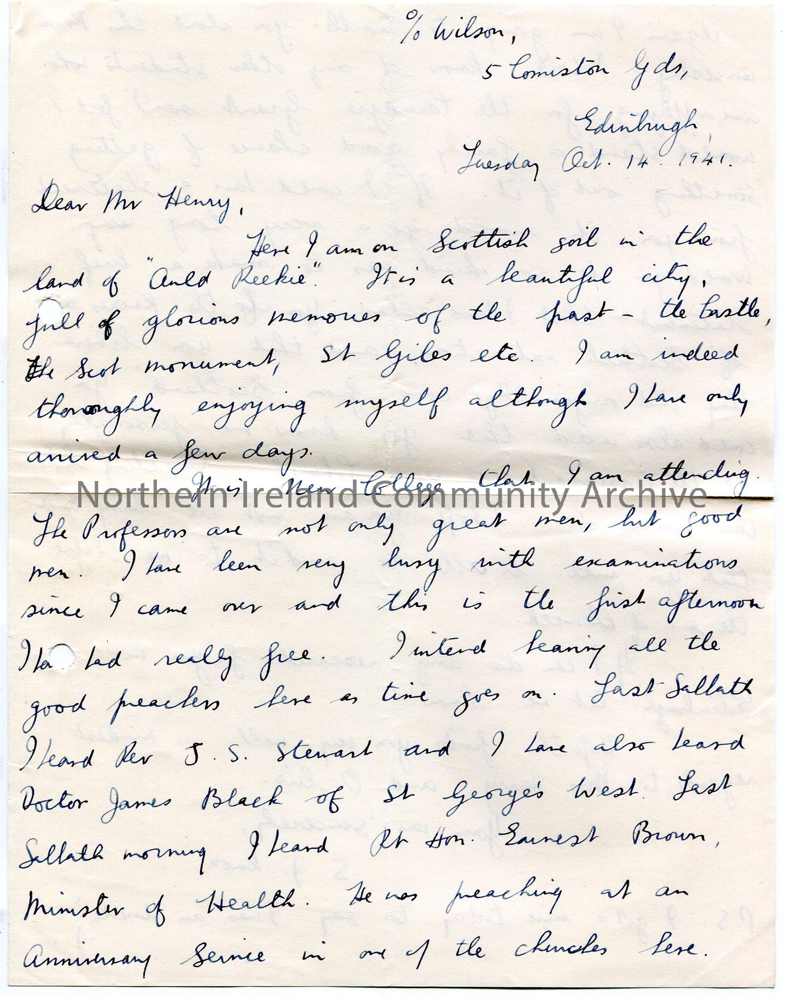 Handwritten letter (double sided) to Mr Henry. Writes of his time in Scotland and his attendance at New College. Writing re Knox ancestry and possible…