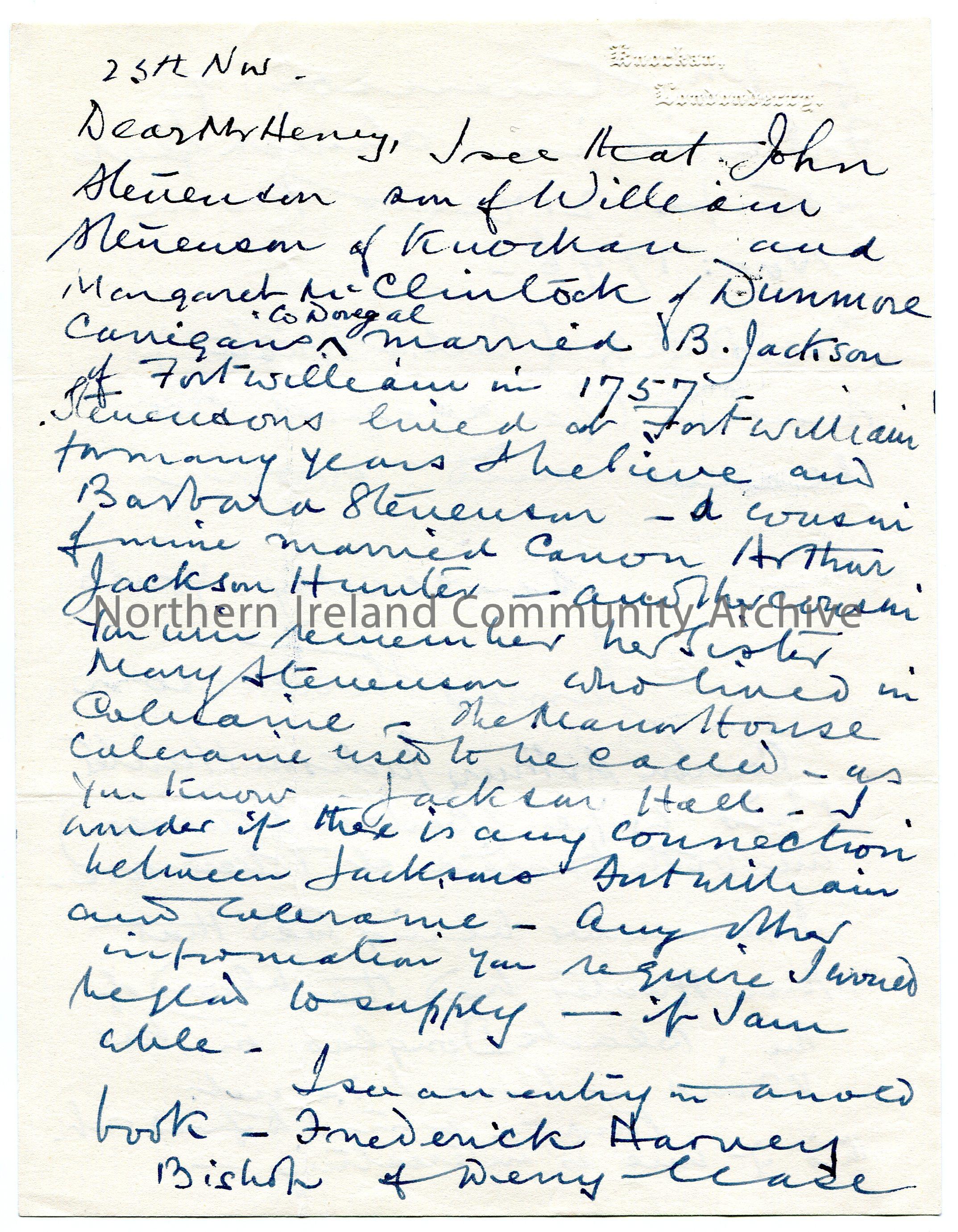 Handwritten letter (double sided) to Mr Henry. Writing re Jackson and Stevenson families. Mentions that the Manor House in Coleraine was previously called Jackson Hall. Notes that he is writing a book re Frederick Harvey, Bishop of Derry.