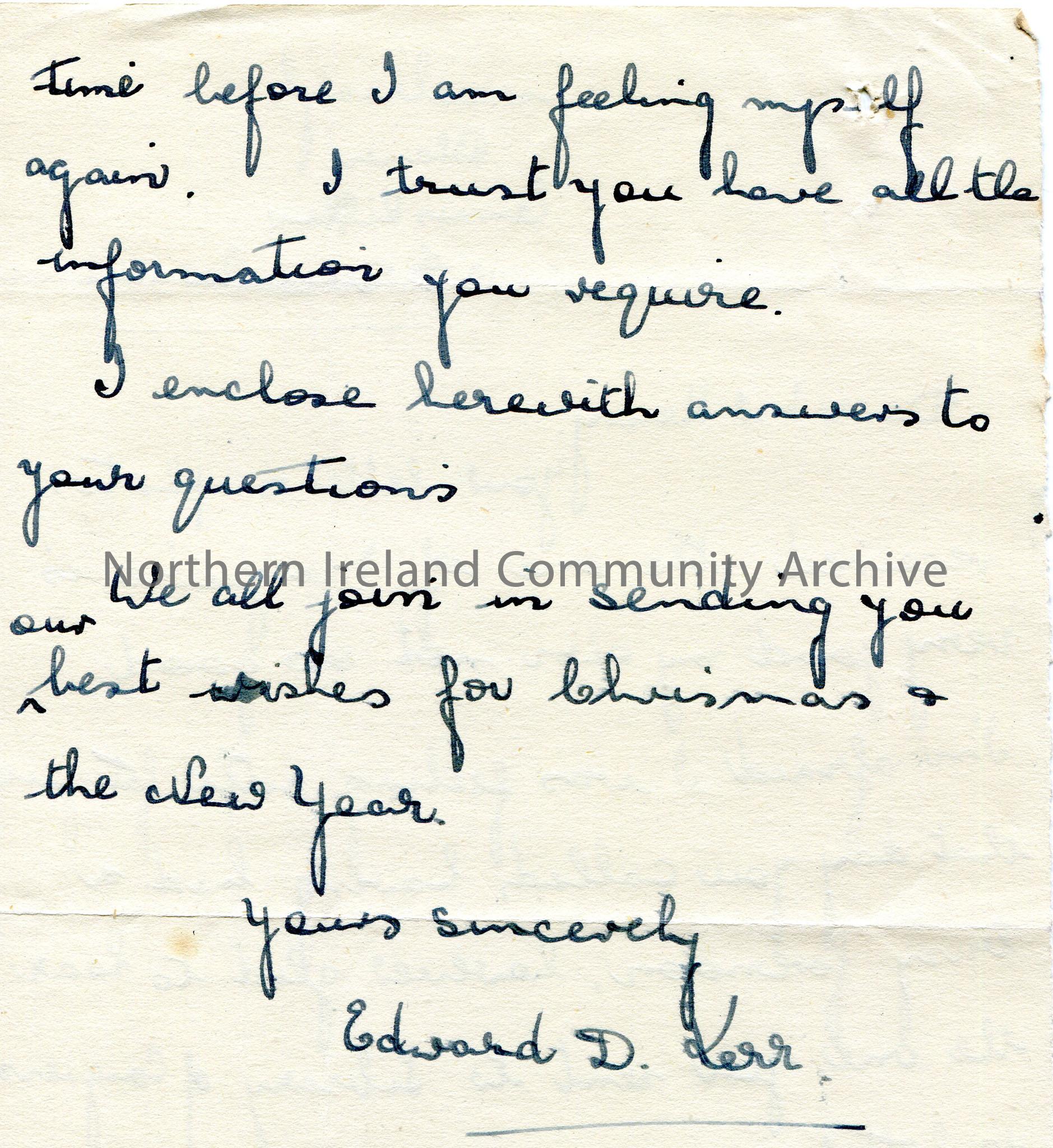 Handwritten letter (double sided) to Mr Henry. Writing re photographs of himself that were sent to Sam. He has been ill and confined to his room. Encloses answers to questions - See CM:2017:1129.2-3. Sends his wishes for Christmas and New Year.