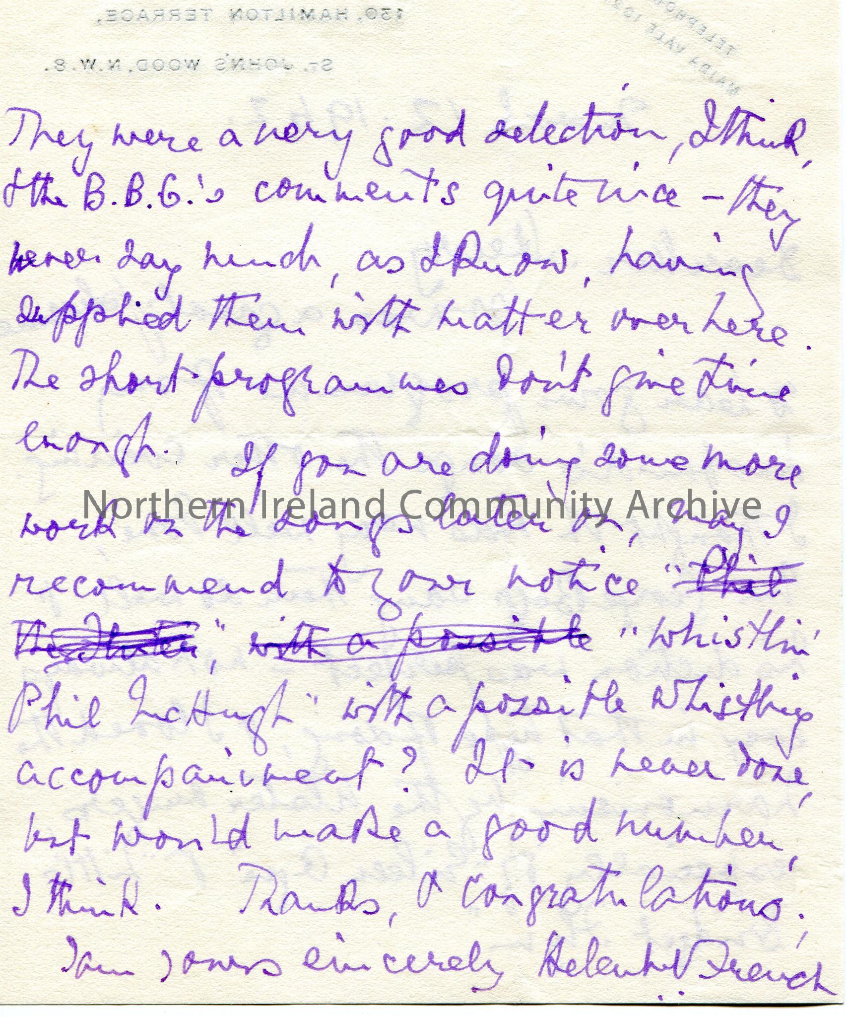 Handwritten letter (double sided) to Mr Henry. Writing to congratulate Sam on the broadcast re Percy French. Suggests Sam use the song ‘Whistlin’ Phil… – scan190b