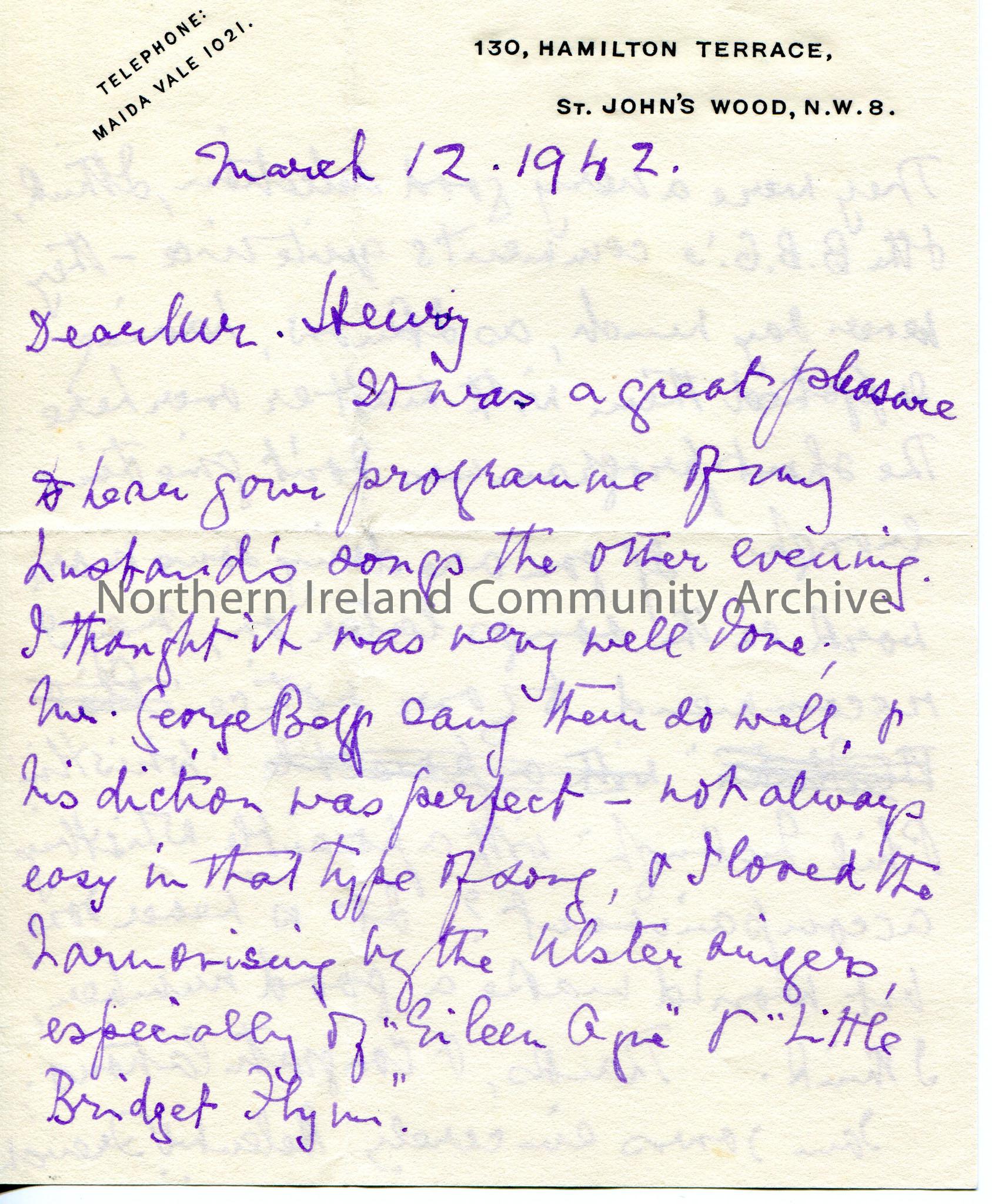 Handwritten letter (double sided) to Mr Henry. Writing to congratulate Sam on the broadcast re Percy French. Suggests Sam use the song ‘Whistlin’ Phil…