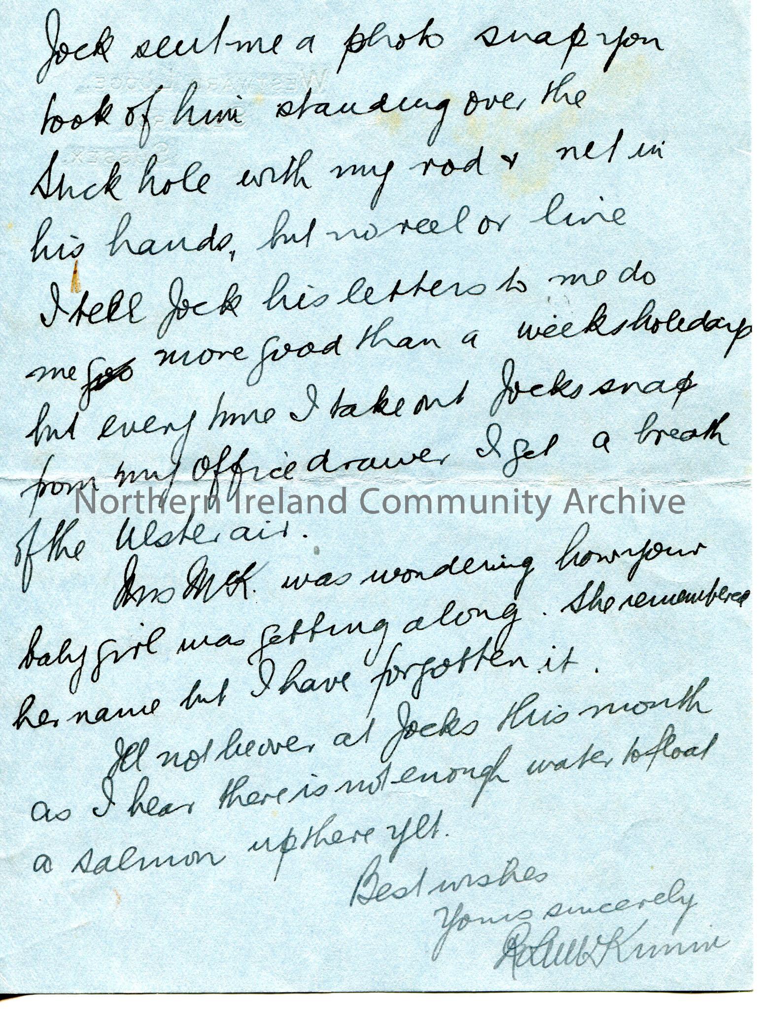 Handwritten letter (double sided) to Mr Sam Henry. Thanks Sam for doing the broadcast. Found it hard to hear on the wireless. Preferred Sam's broadcast from Coleraine as it contained a song which reminded them of their relatives. Writes that Jock has sent them a photograph that Sam took of him with fishing equipment. Writes that 'Mrs K' asks of Sam's 'baby girl'.