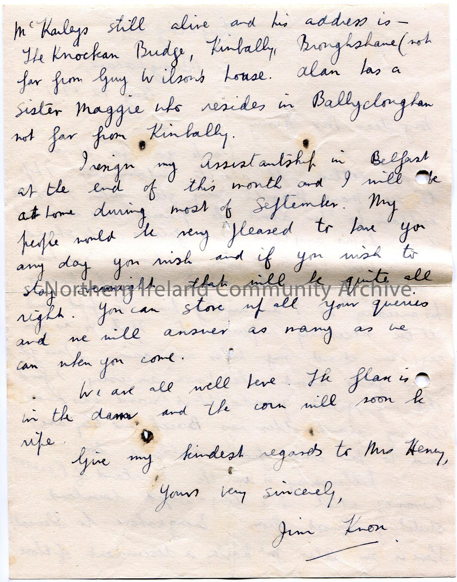 Handwritten letter (double sided) to 'My dear Mr Henry'. To speak to Mary Magill re pension and fairies. Writes of his ancestry - Knox and Buick family names. Tells Sam that he can call with his 'people' in Belfast any time and stay overnight if he wishes.