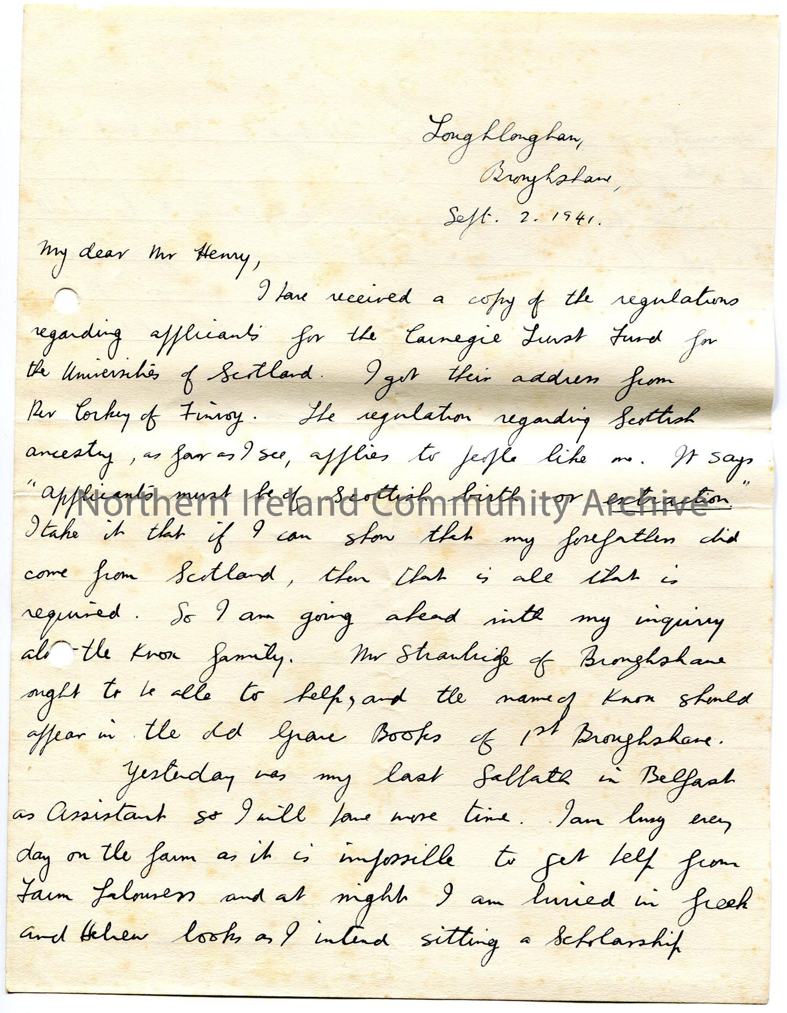Handwritten letter (double sided) to 'My dear Mr Henry'. Writing re his application for the Carnegie Trust Fund for the Universities of Scotland and its regulations. Writes that it was his last Sabbath as an assistant in Belfast yesterday and that he has been busy on the farm. Writes of his impending move to Edinburgh and hopes to avail of the Trust Fund as it will pay £7 of his £12 fees for University.