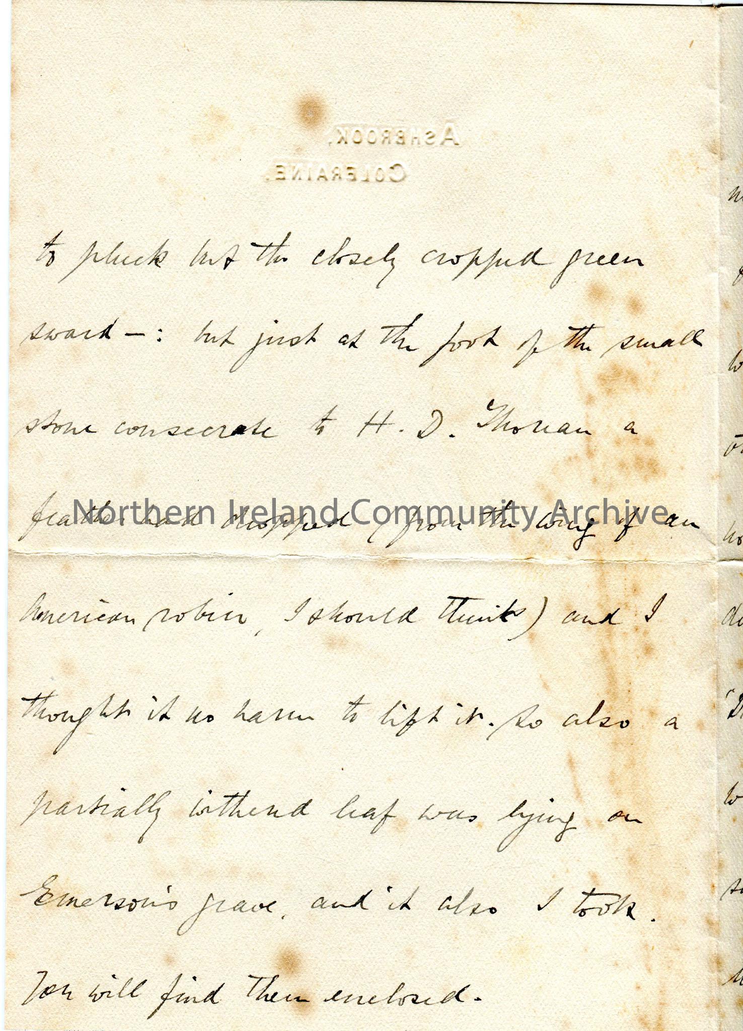 Handwritten letter (double sided) to ‘My dear Sam’. Writes that he encloses a bird feather and leaf from Concord Cemetery, Massachusetts. Writes of a … – scan070b