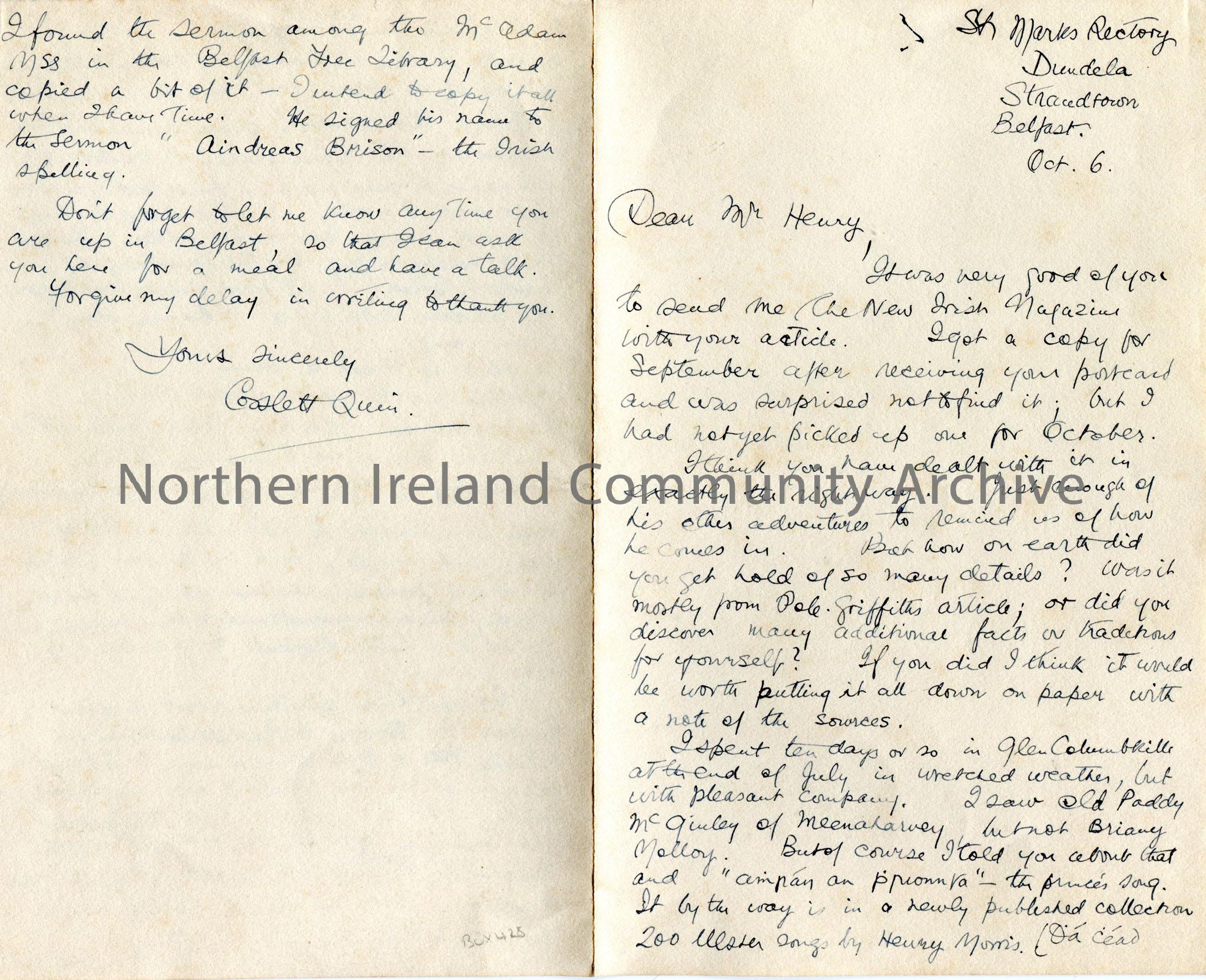 Handwritten letter, double sided, to Sam Henry. Addressed from St Marks Rectory, Dundela, Strandtown, Belfast. Dated 6th October. Thanks Sam for sending him The New Irish Magazine with his article. Asks Sam where he got all the details for the article and suggests making a note of this. He spent ten days in Glencolumbkille at end of July. He saw old Paddy McQiuley of Meenaharvey but not Briany Molloy. Refers to the prince's song. Mentions a published collection of 200 Ulster songs by Henry Morris. Discusses the word 'beann'? and its meaning. Travelled to Tyrone last Thursday and talked with 3 people but found the Irish accent difficult to understand. Asks Sam if he knows anything about Andrew Bryson, a Presbyterian Minister from Dungannon, as he came across a sermon of his in the Belfast Free Library.
