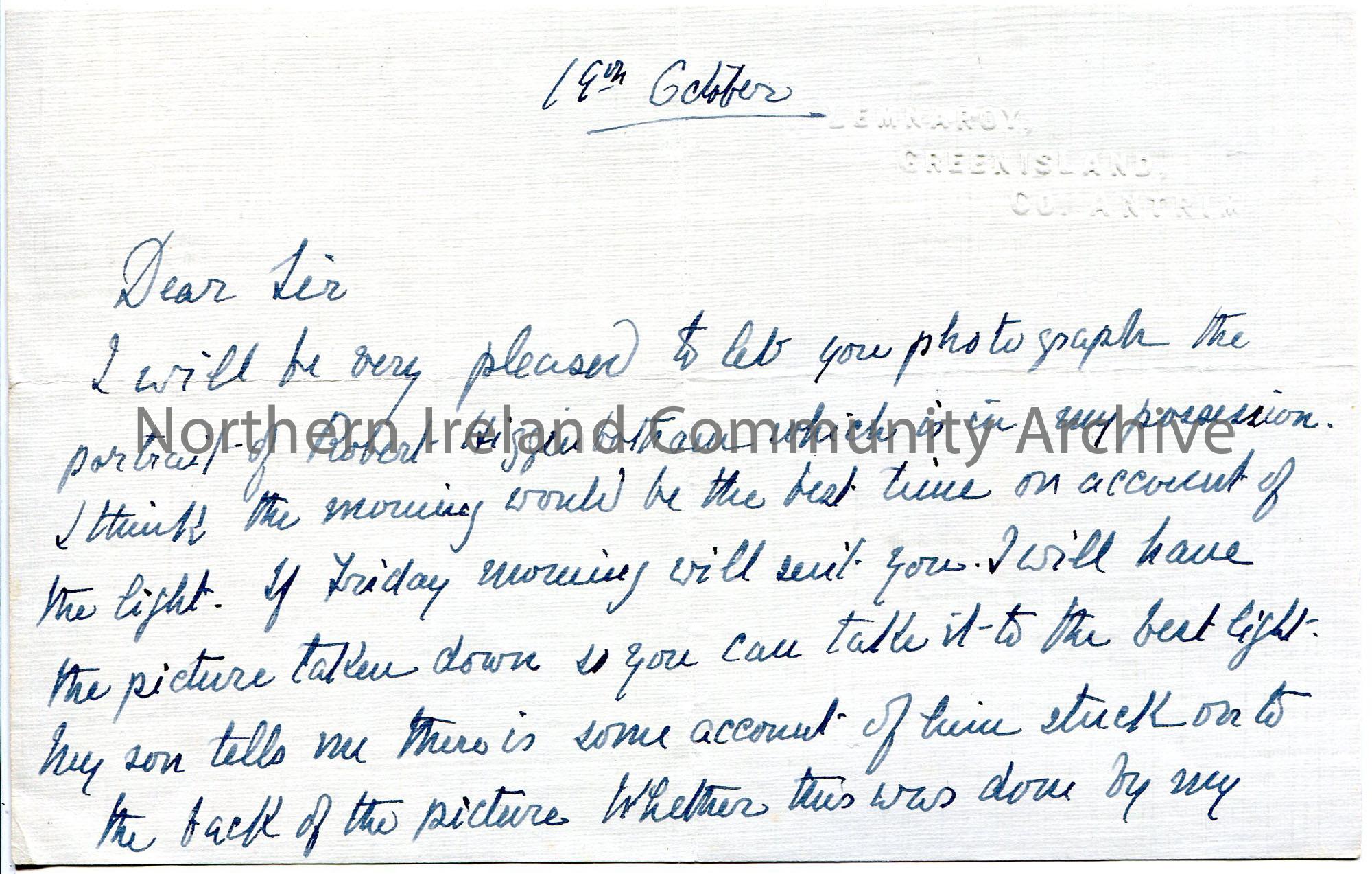 Handwritten letter (double sided) to Sam Henry. Arranging for a time for Sam to photograph a portrait of Robert Higginbotham. Rough notes in pencil which mention Robert Kyle Knox written on back of letter.