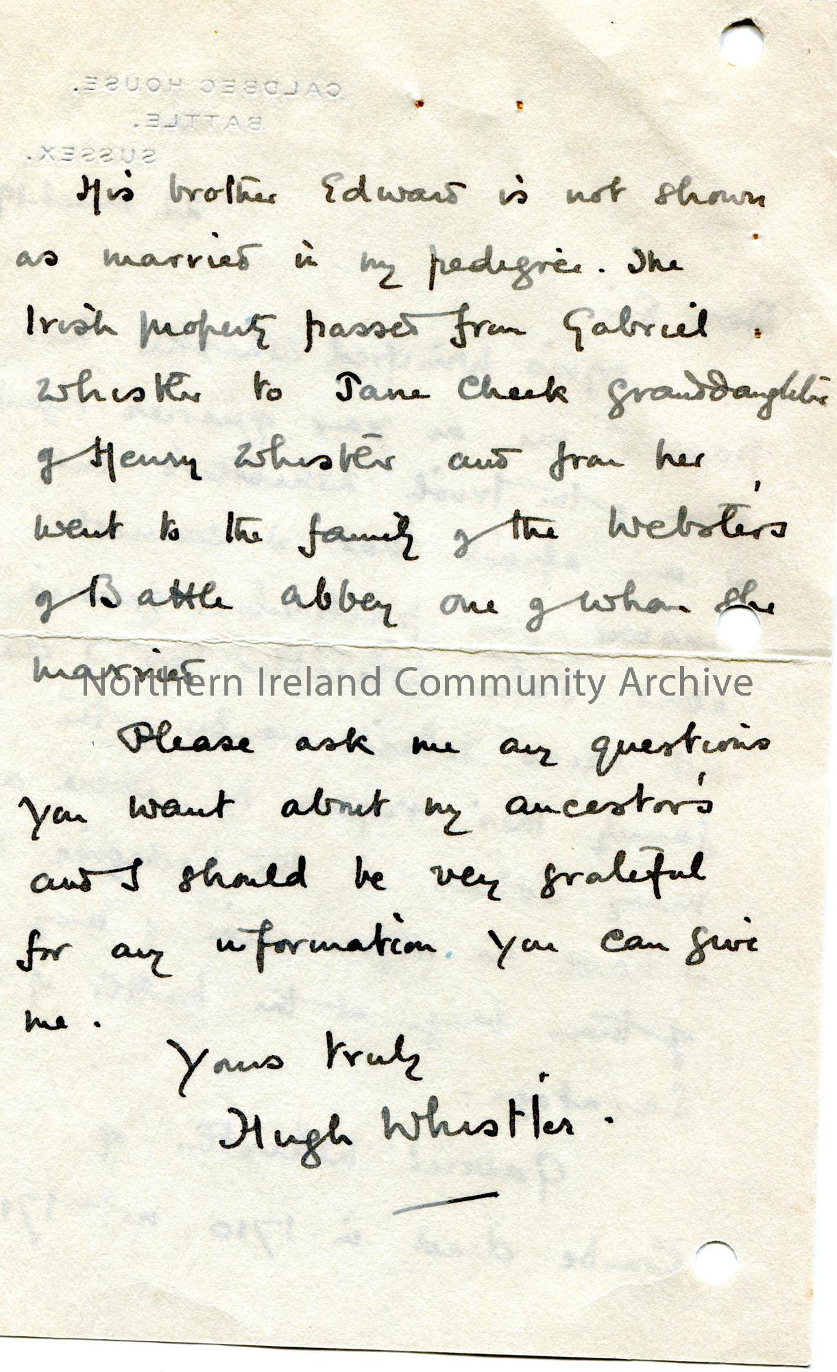 Handwritten letter (double sided) to Sam Henry. Cannot answer Sam's queries re the Irish Whistlers.