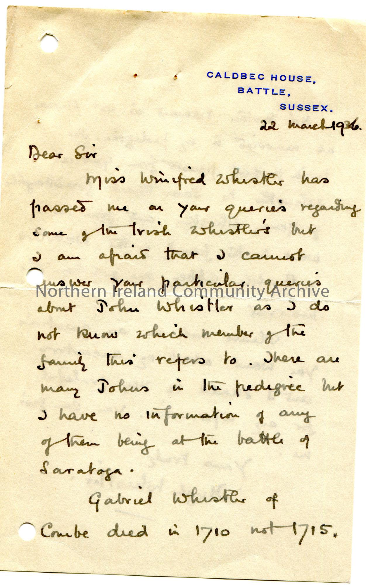 Handwritten letter (double sided) to Sam Henry. Cannot answer Sam’s queries re the Irish Whistlers.