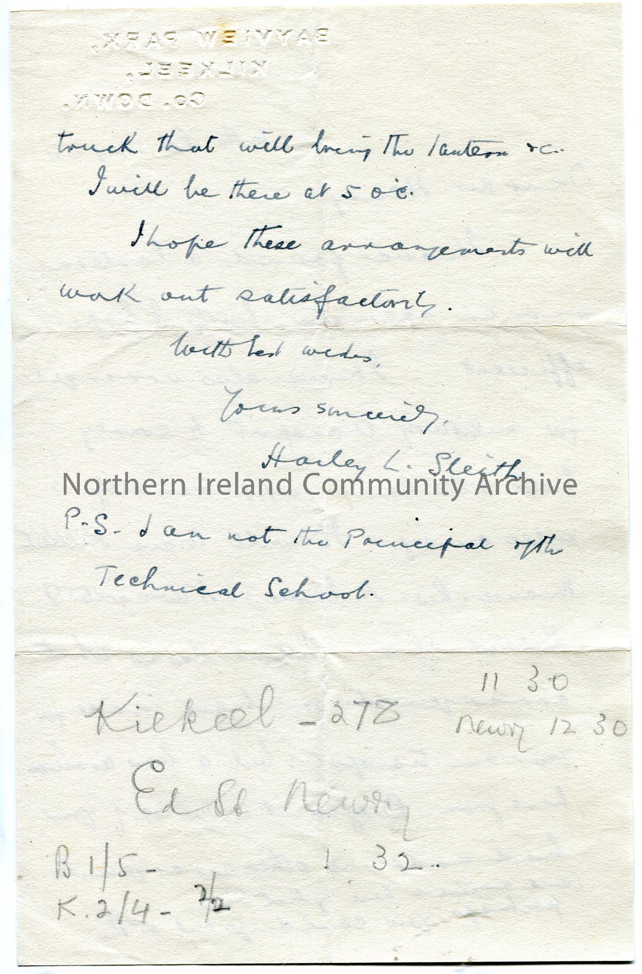 Handwritten letter (double sided) to Sam Henry. Discussing travel arrangements for the lantern, lantern oparator and Sam to a lecture. Notes that they are not the principle of the Technical School.