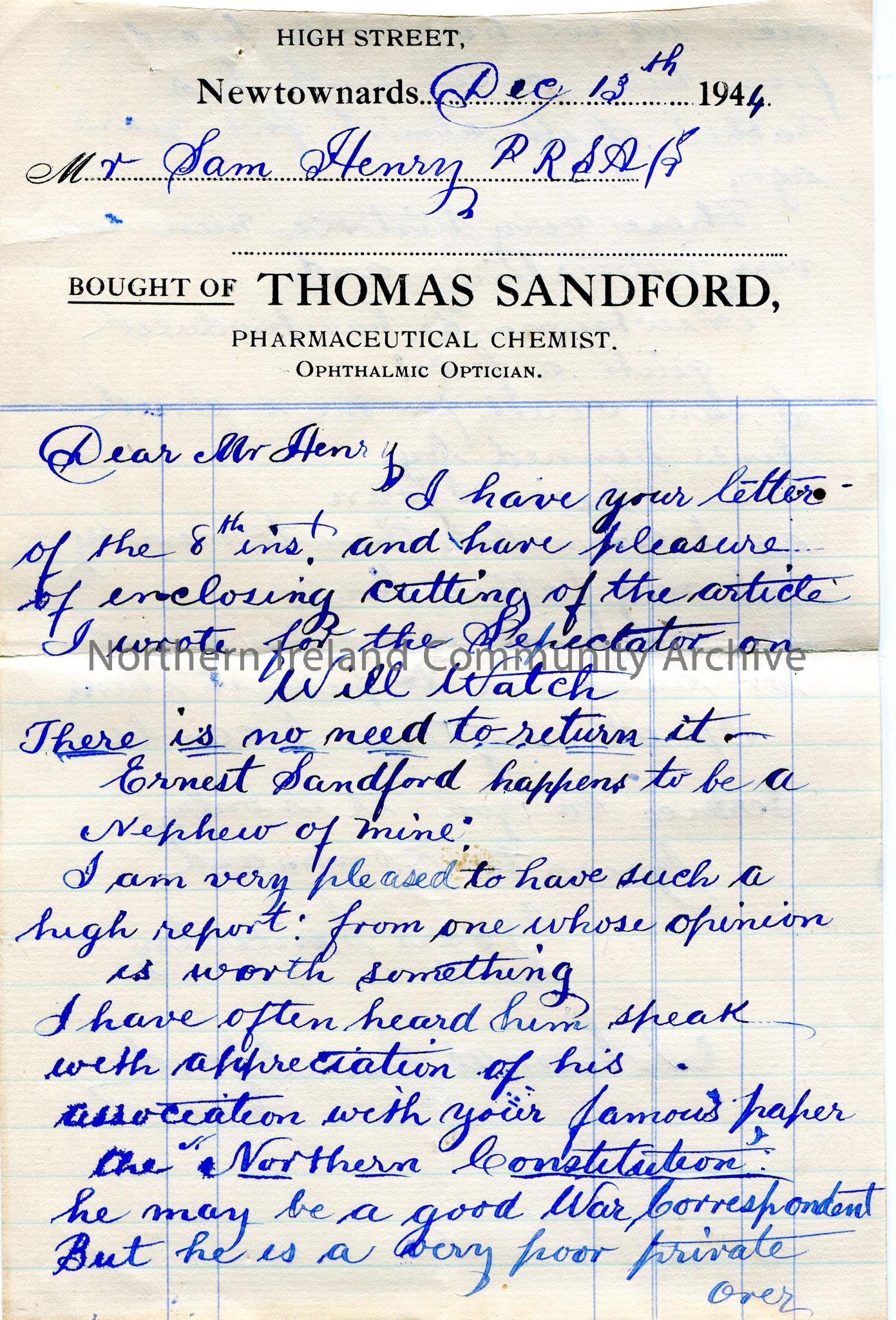 Handwritten letter (double sided) to Sam Henry. Encloses newspaper article from the Spectator re Will Watch. His nephew, Ernest Sandford, war correspondent, has associated with the Northern Constitution. States Newtownards has produced a few historic men. States he has enclosed 'lines' by Irwin Sloan in the newspaper article.