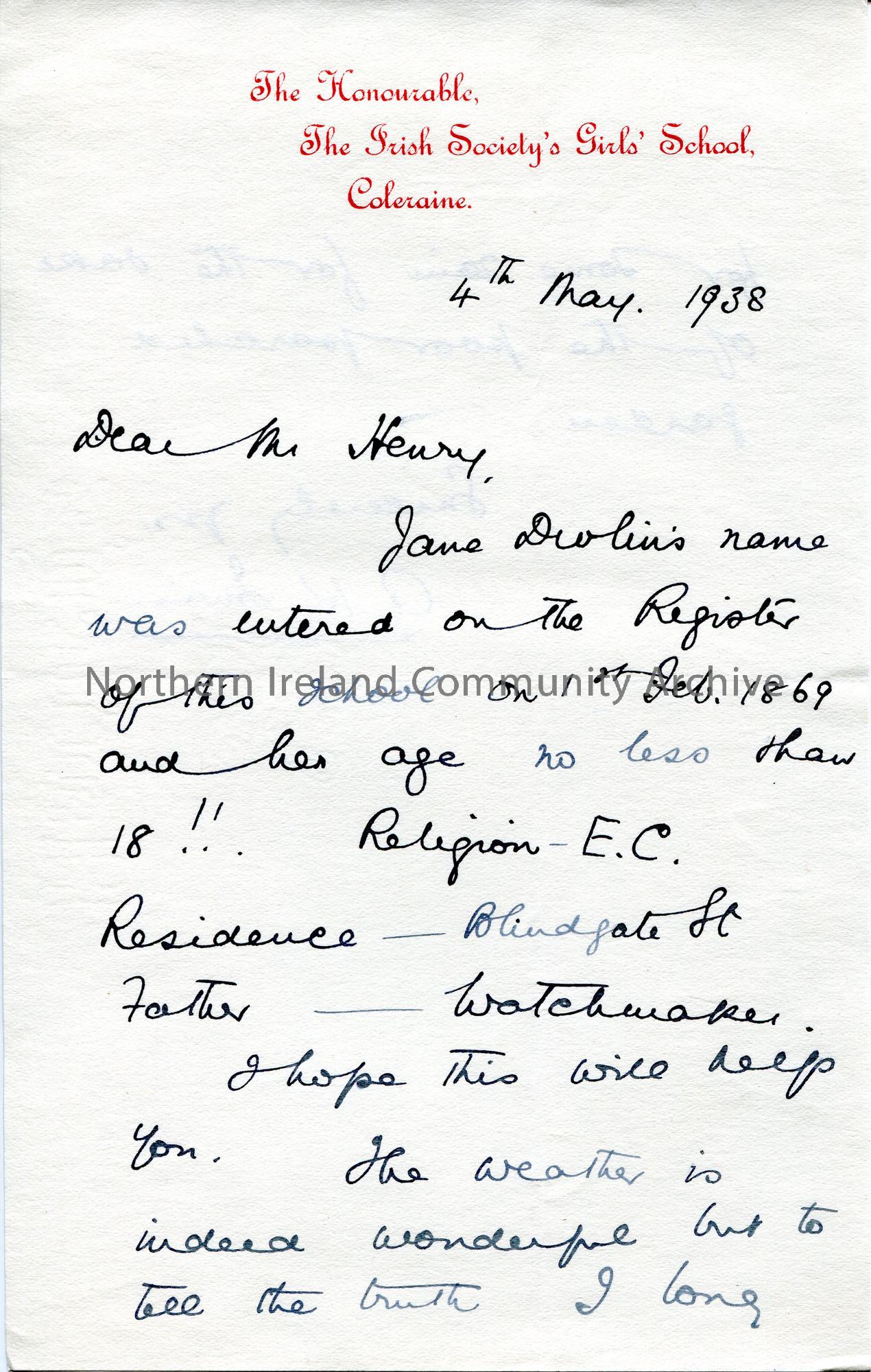 Handwritten letter (double sided) to Sam Henry from A K Irwin. They had carried out a search for Sam in the school Register for the name Jane Devlin. …