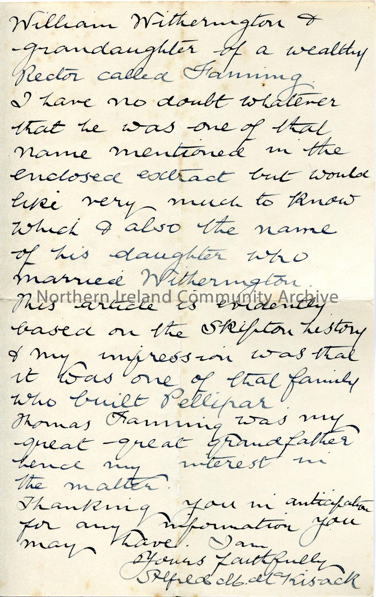 Handwritten letter (double sided) to Sam Henry from Alfred McKisack. Heard via the Route Field Club that Sam had an interest in genealogy. Would like to find out the grandfather of Wolfe Tone's wife.