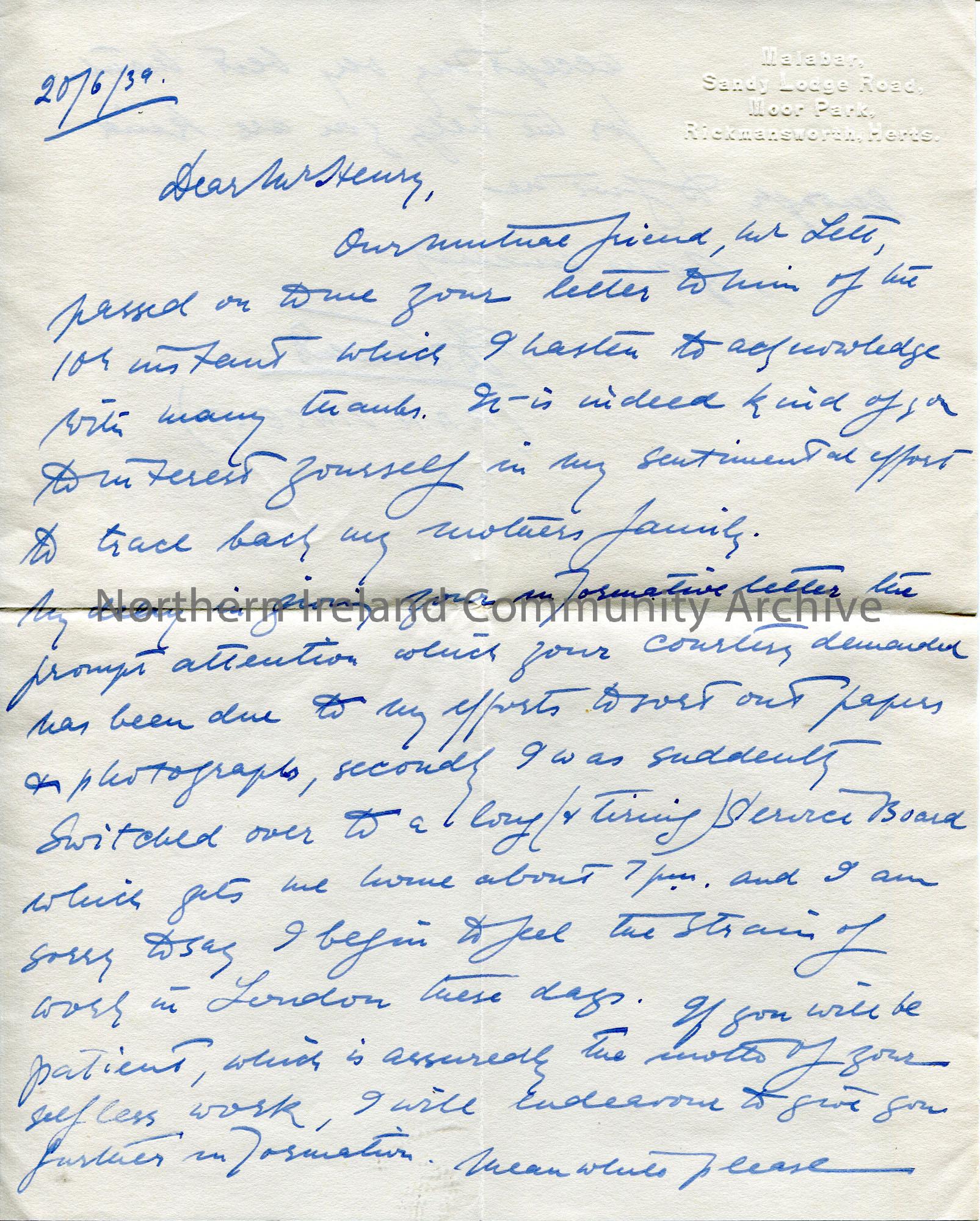 Handwritten letter (double sided) to Sam Henry from F. A. M. Vincent. Mutual friend of Mr Lett. Thanks Sam for his interest in helping him trace his mother's family tree. Apologises for late reply to Sam's letter.