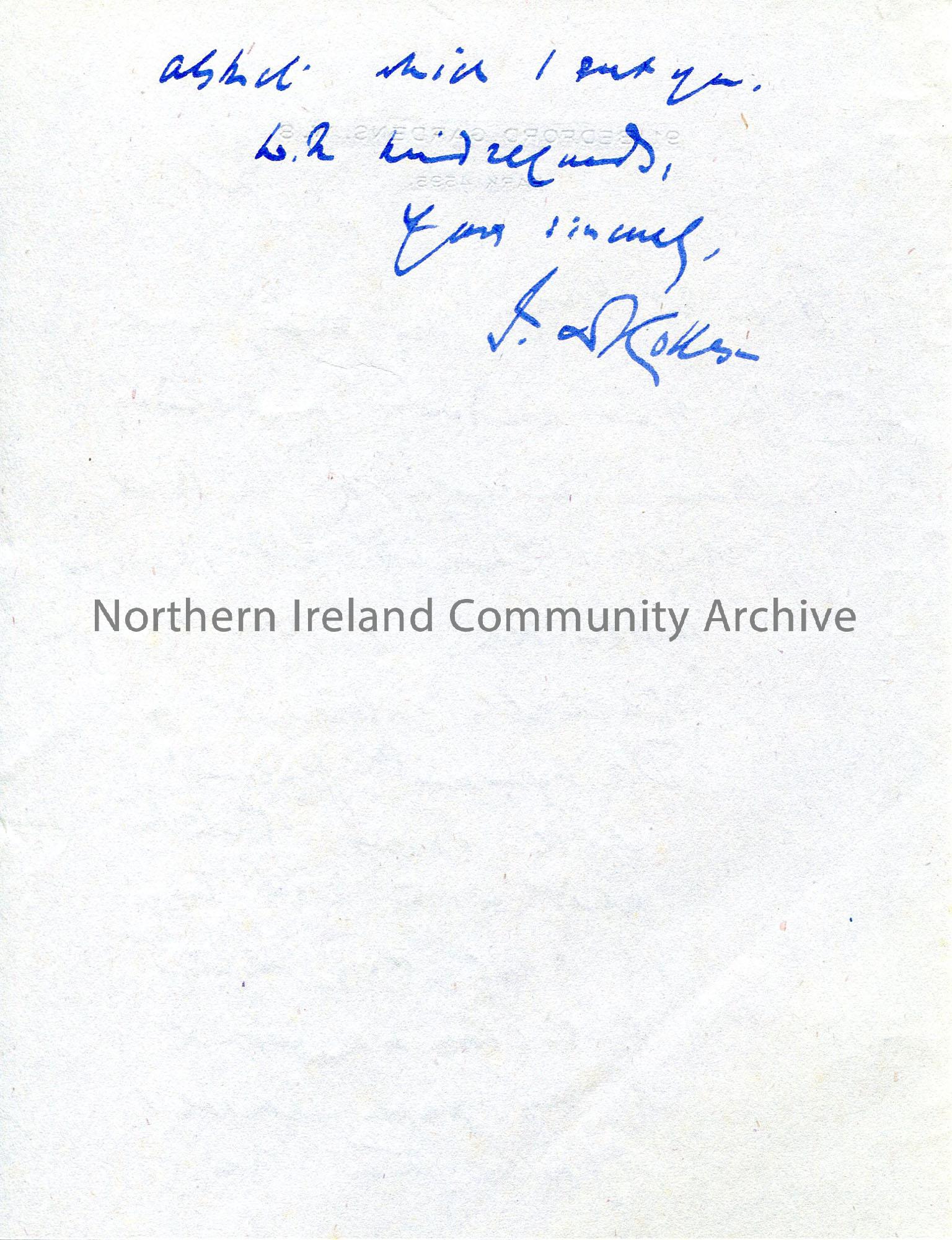 Handwritten letter (double sided) to Sam Henry from J D Rolleston. Thanks Sam for sending a copy of 'The Bill'. They are particulary interested in "Dairymaid ? " Encloses reprint of their paper.