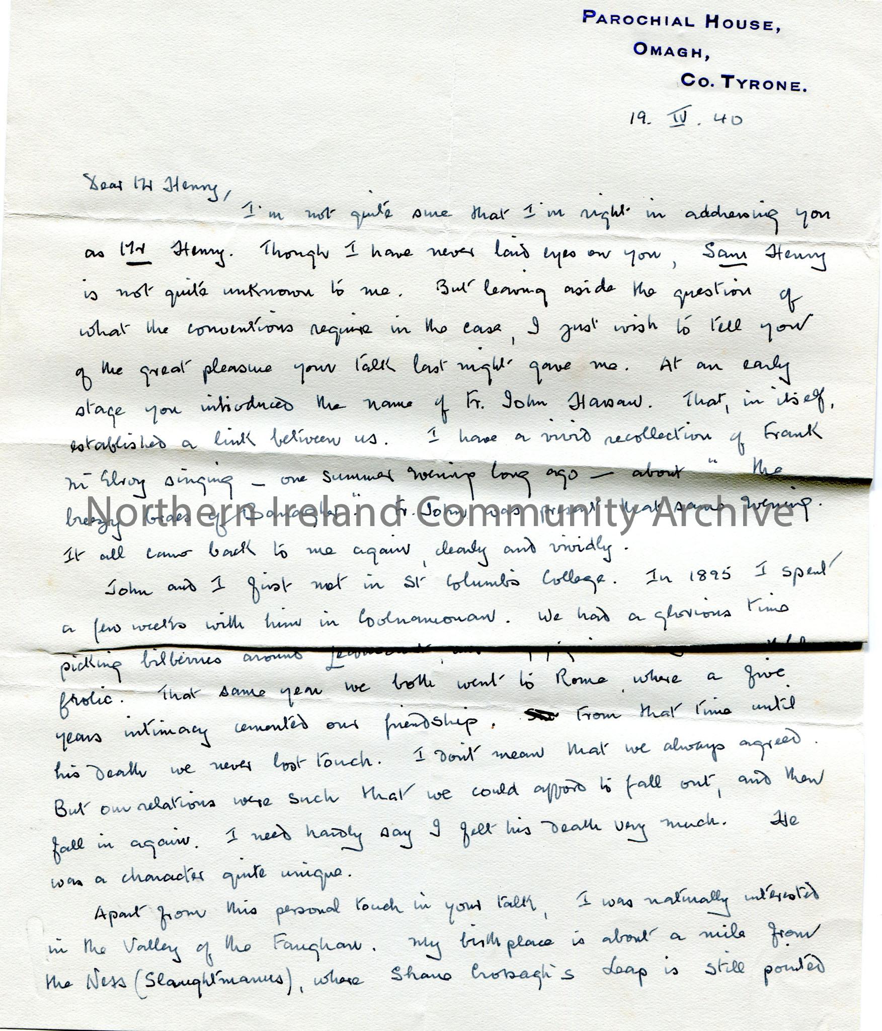 Handwritten letter, double sided, to Sam Henry from J. McShane of Parochial, Omagh, Co. Tyrone. Dated 19th April, 1940. Praises Sam for talk last night. Recognised the name Fr John Harsaw? in the talk and writes of how he knows him. He write he was also born near Ness, Slaughtmanus and its connection to the talk.