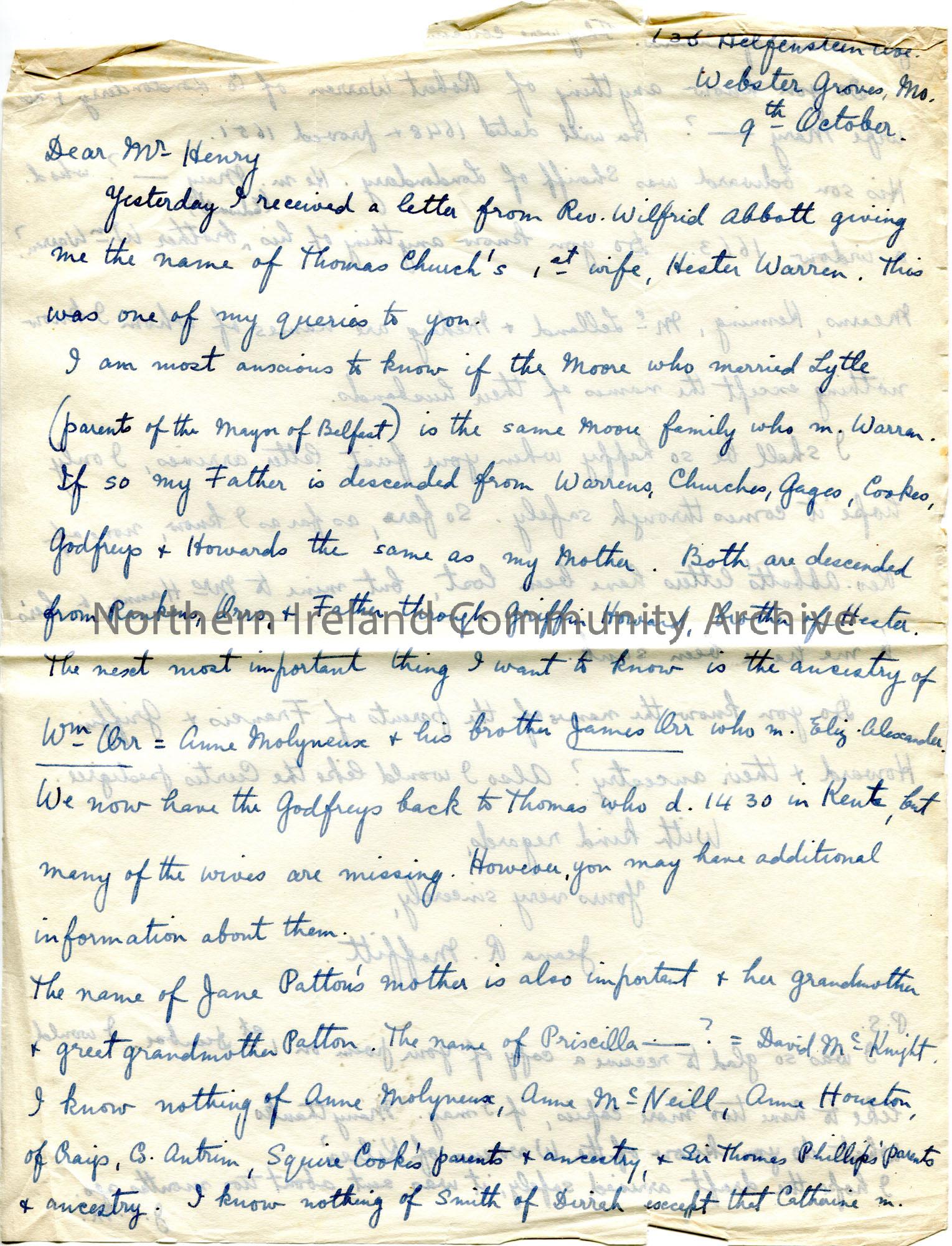Handwritten letter (double sided) to Sam Henry from Jeana R. Moffitt. Requests help from Sam to trace the ancestors of William and James Orr; Godfreys; Patton ancestry; McNeill, Houston, Cooke; Phillip; Robert Warren of County Londonderry and family; parental names of Frances and Griffin Howard; Curtis pedigree; Warrens of Kilrea. Request another copy of Sam's poem re 1st Dunboe.