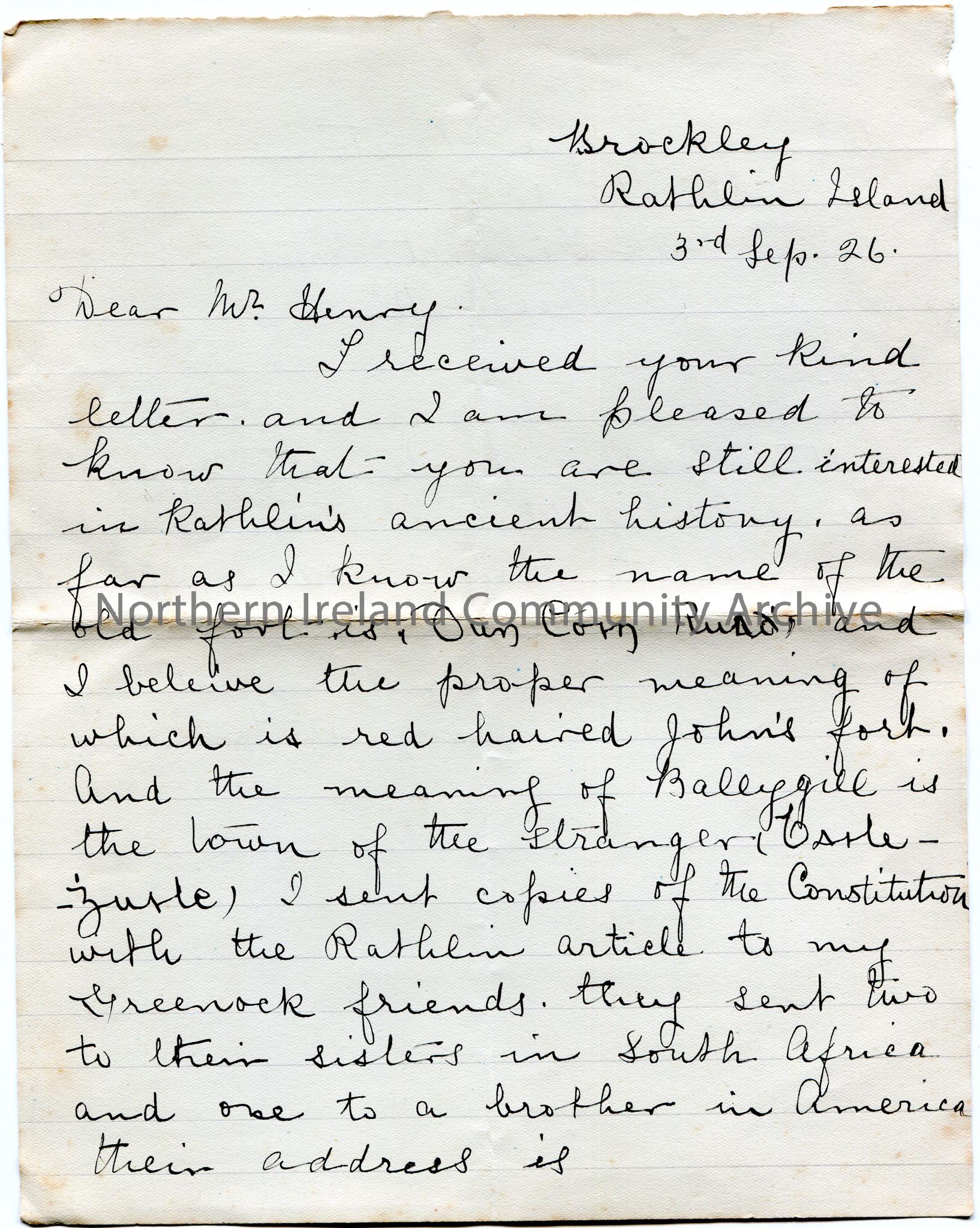 Handwritten letter, double sided, to Sam Henry. From Margaret McCurdy. Dated 3rd September, 1926. Thanks Sam for his letter re Rathlin Island's history with reference to the old fort. She states the name of the old fort is 'Oun Corn Rund'? and believes it means 'red haired John's fort'. The meaning of Ballygill is 'the town of the stranger'. Forwarded copies of a Rathlin article in the Constitution to John and Dougie Preston, Strathledene, 29a Finmart Street, Greenock. Thanks Sam for the 'little Gaelic book' of songs.