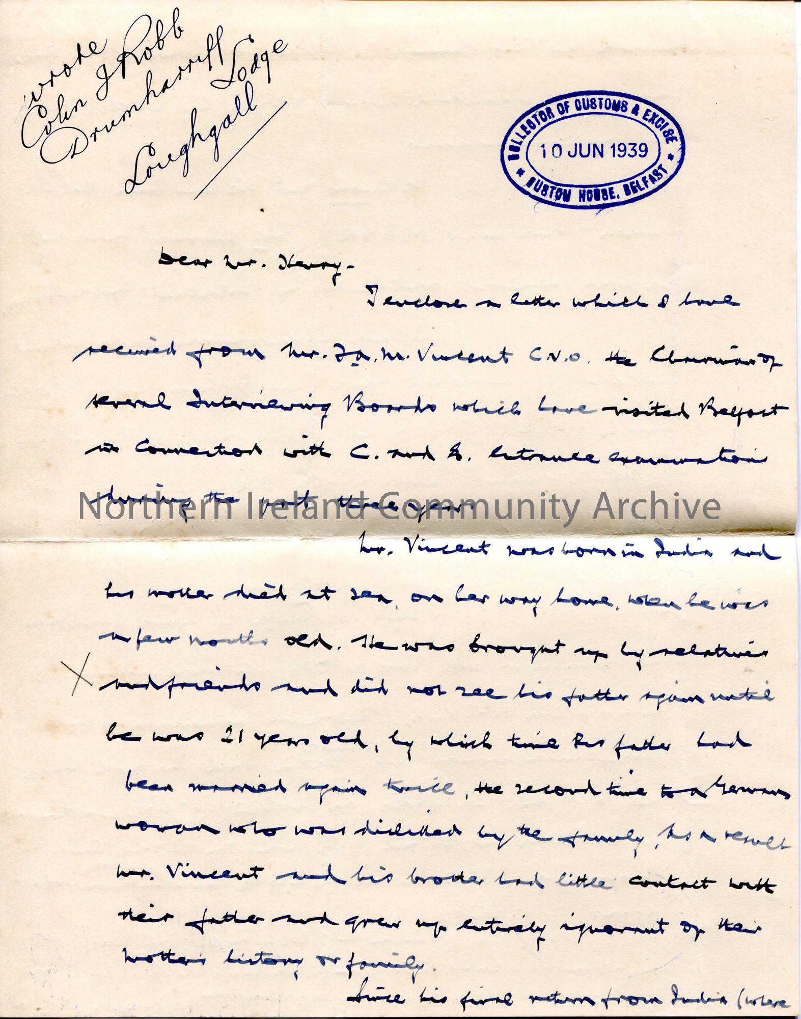 Handwritten letter (double sided) to Sam Henry from W T C Lett. Encloses letter from F A M Vincent who would like to trace his mother's family members - she was Irish, her maiden name was Money and was Protestant Episcopalian. Gives an overview of the letter and asks Sam to help in the research.
