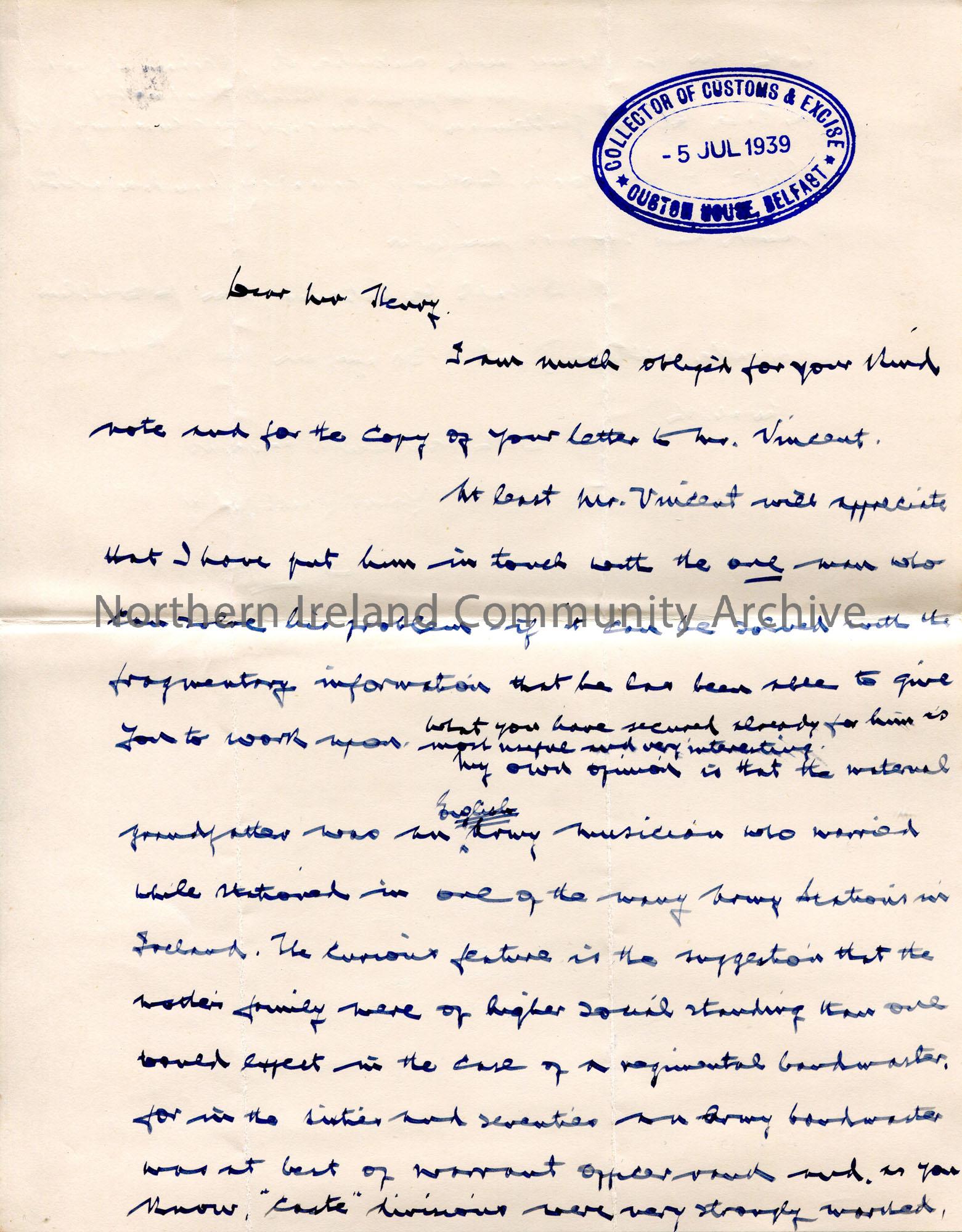Handwritten letter (double sided) to Sam Henry from W T C Lett. Writing re the family history of Mr F A M Vincent and Sam Henry’s help with the resear…