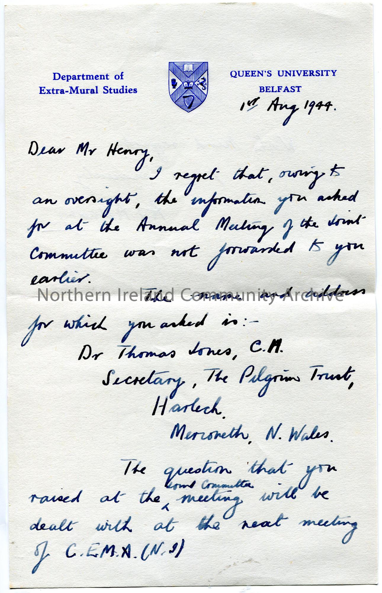 Handwritten letter (double sided) to Sam Henry. Gives Sam the name and address of Dr Thomas Jones, Secretary of The Pilgrims Trust, N. Wales. Sam had raised a question with the land committee but will be answered at a meeting of C.E.M.A (N.I.)