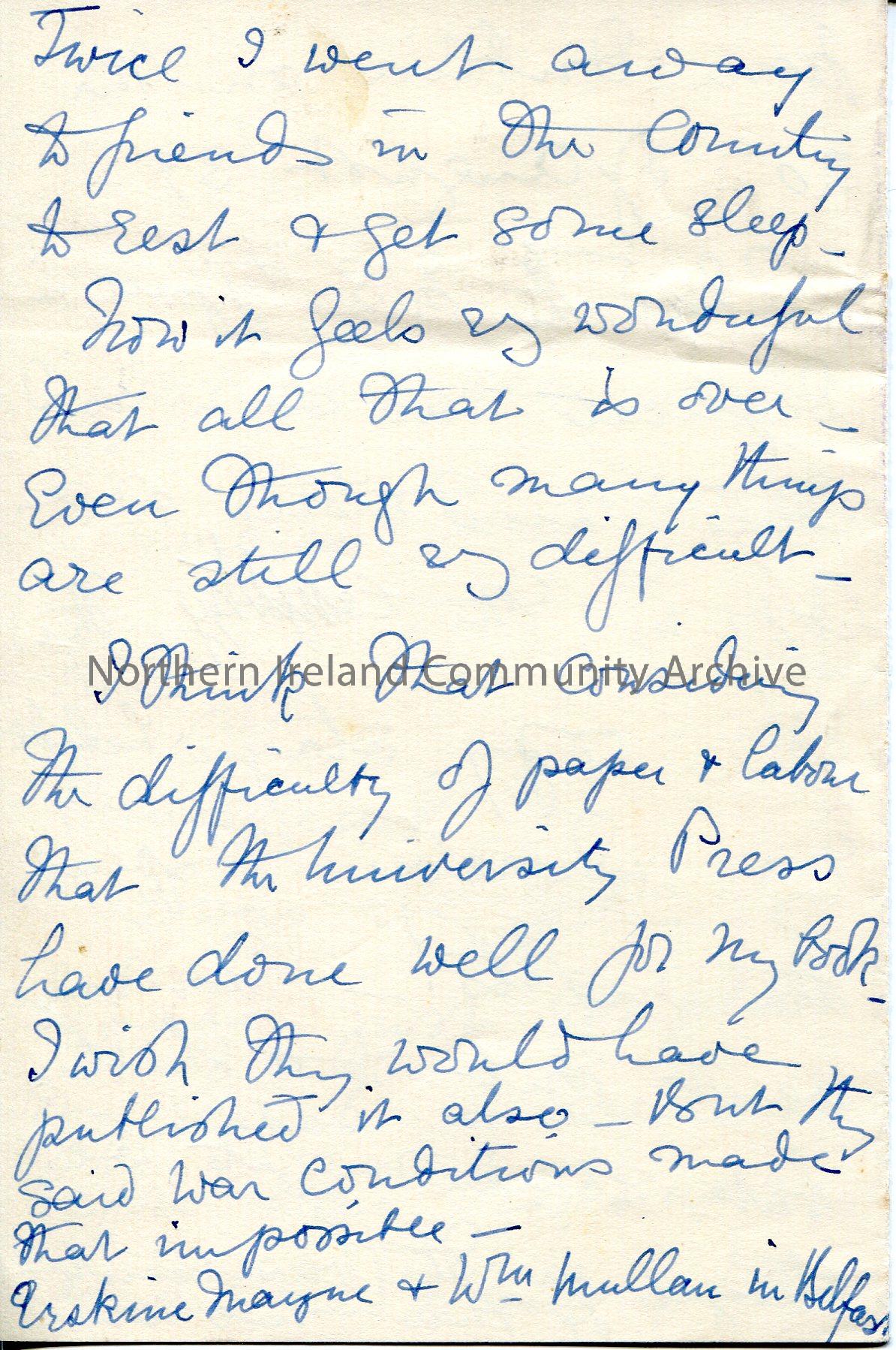 Handwritten letter (double sided) to Sam Henry. Informing Sam that her book, titled 'The Wrays of Donegal', has been published and can be obtained in Erskine Mayne & William Mullan in Belfast. Sends Sam a copy. Writes of the impact of the war whilst writing the book - she kept a copy with her at all times.