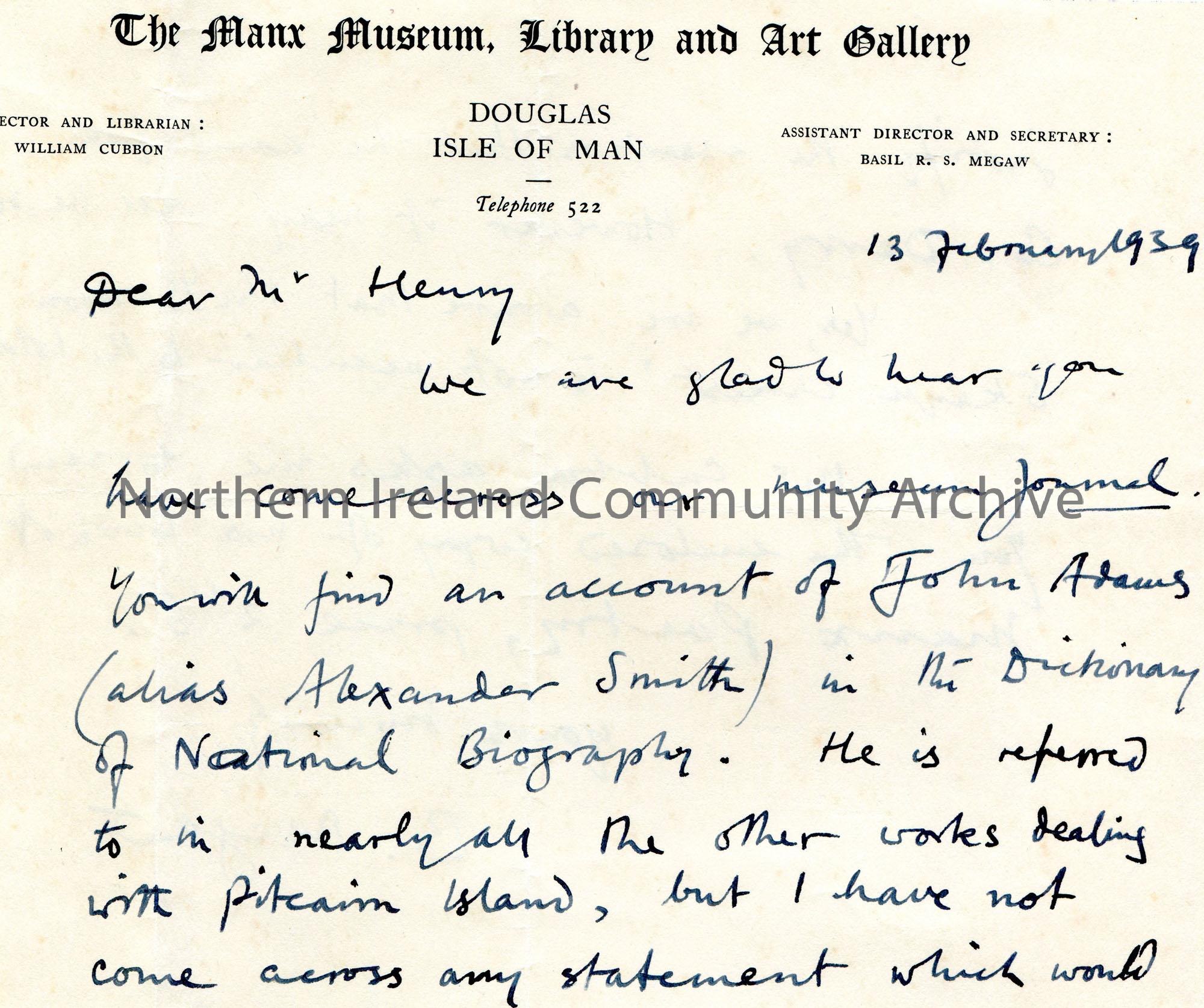 Handwritten letter (double sided) to Sam Henry. Informs Sam they have no information to ascertain that John Adams, Pitcairn Island, came from County Derry.