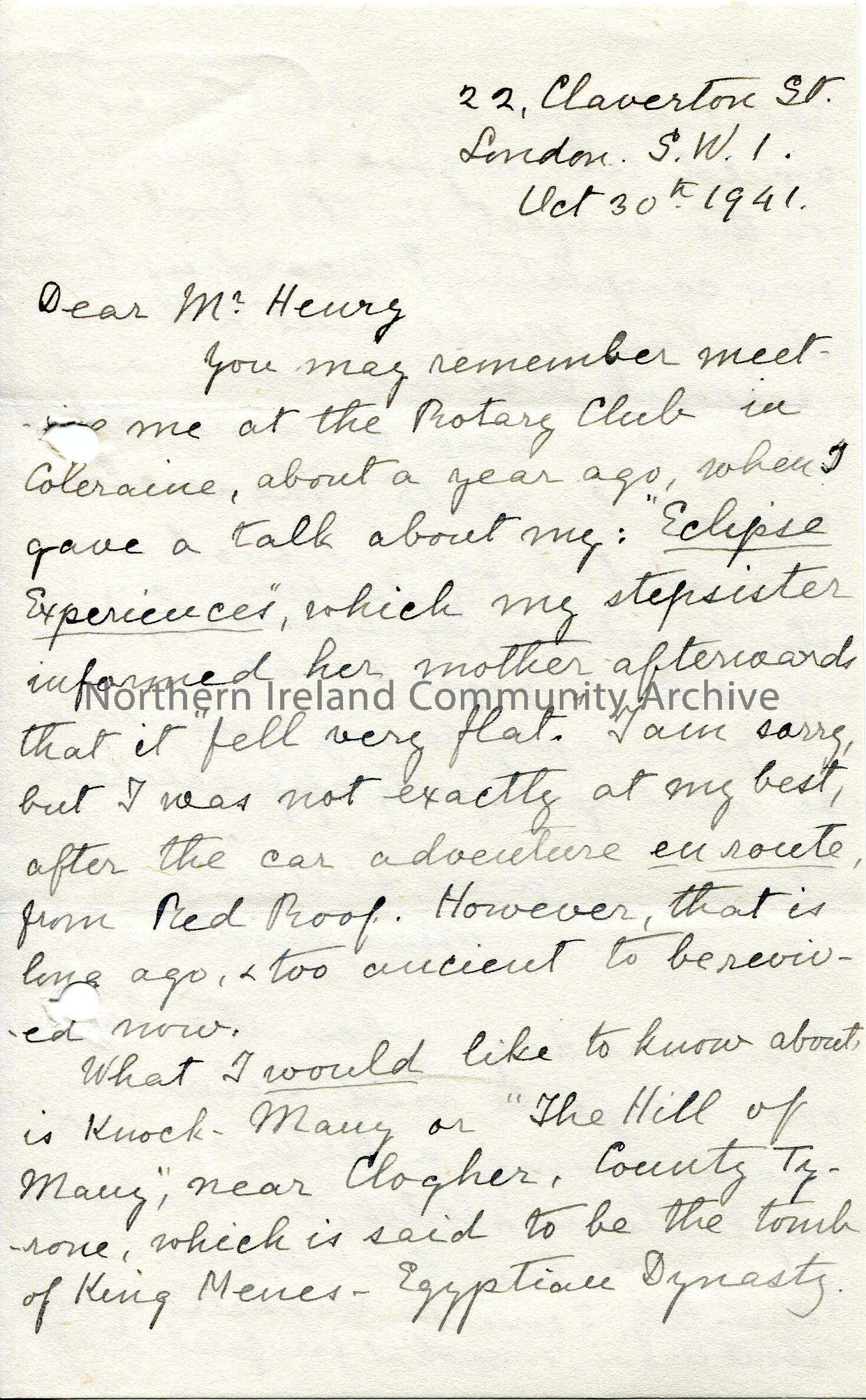 Handwritten letter (double sided) to Sam Henry. Previously met Sam at Rotary meeting which they spoke at. Requests view from Sam re Knock-many, Clogher, for a book he is writing. Hopes to return to Ireland to give another talk with lantern slides.