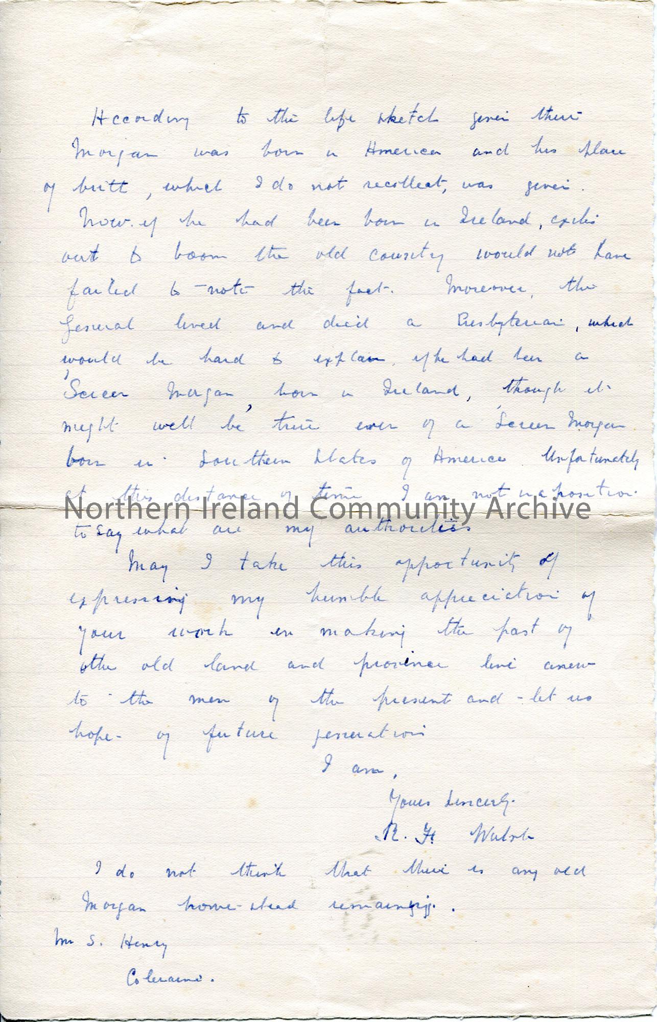 Handwritten letter (double sided) to Sam Henry. Providing Sam with information they have of General [Daniel] Morgan, America. – scan112b