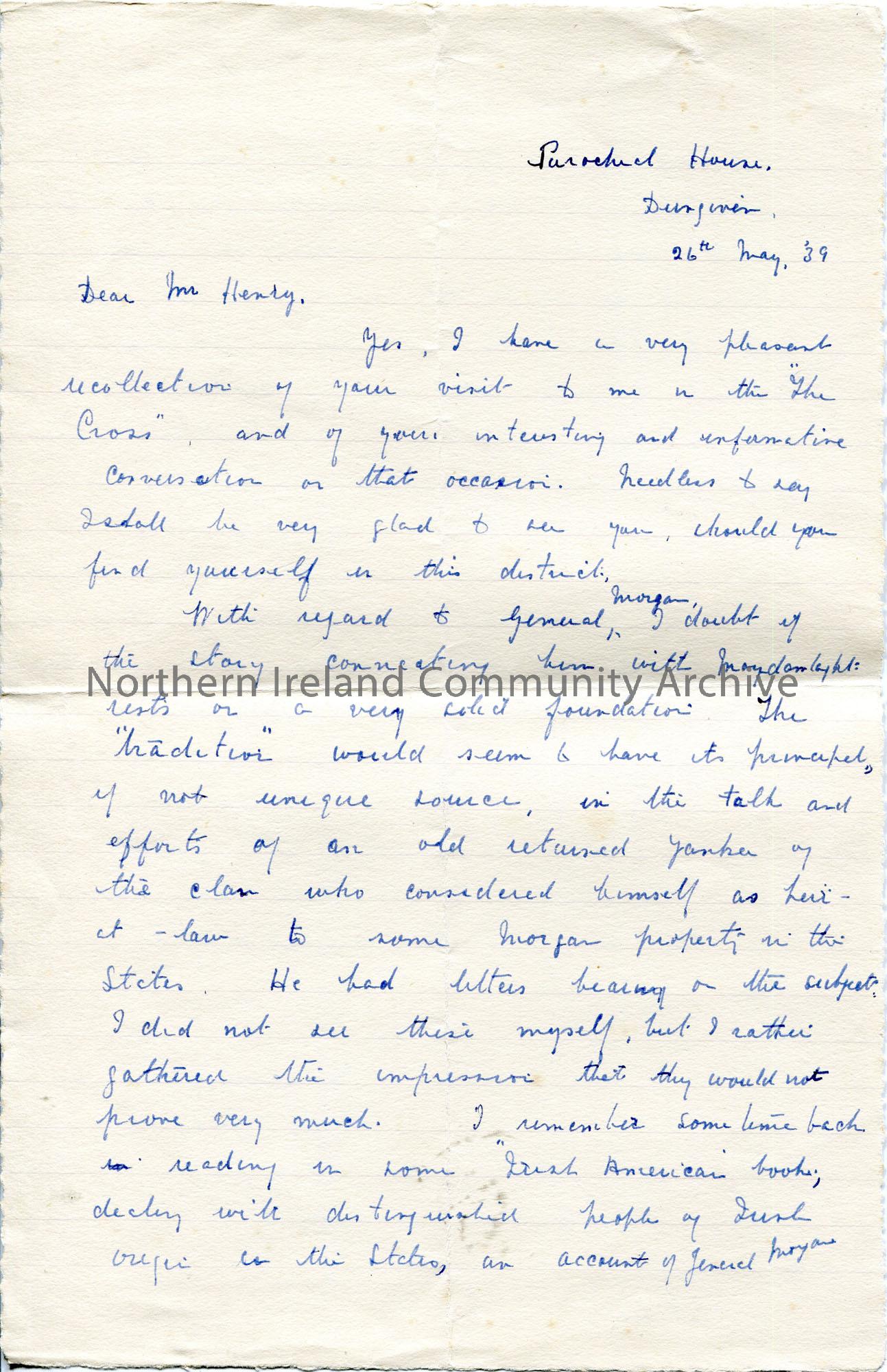 Handwritten letter (double sided) to Sam Henry. Providing Sam with information they have of General [Daniel] Morgan, America.